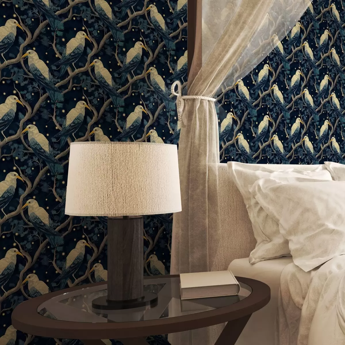 Papel tapiz Pájaros blancos en las ramas entre luciérnagas brillantes en el bosque nocturno Nr. a00109