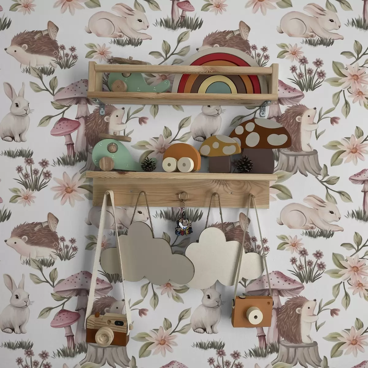 Papel tapiz Erizos y conejos sobre fondo blanco con delicadas flores y setas Nr. a00111v2