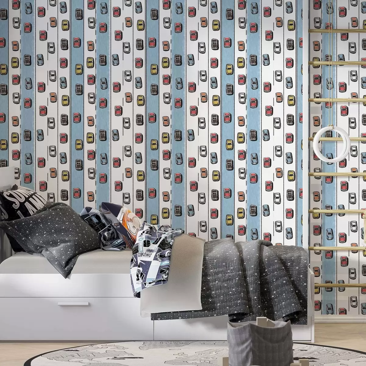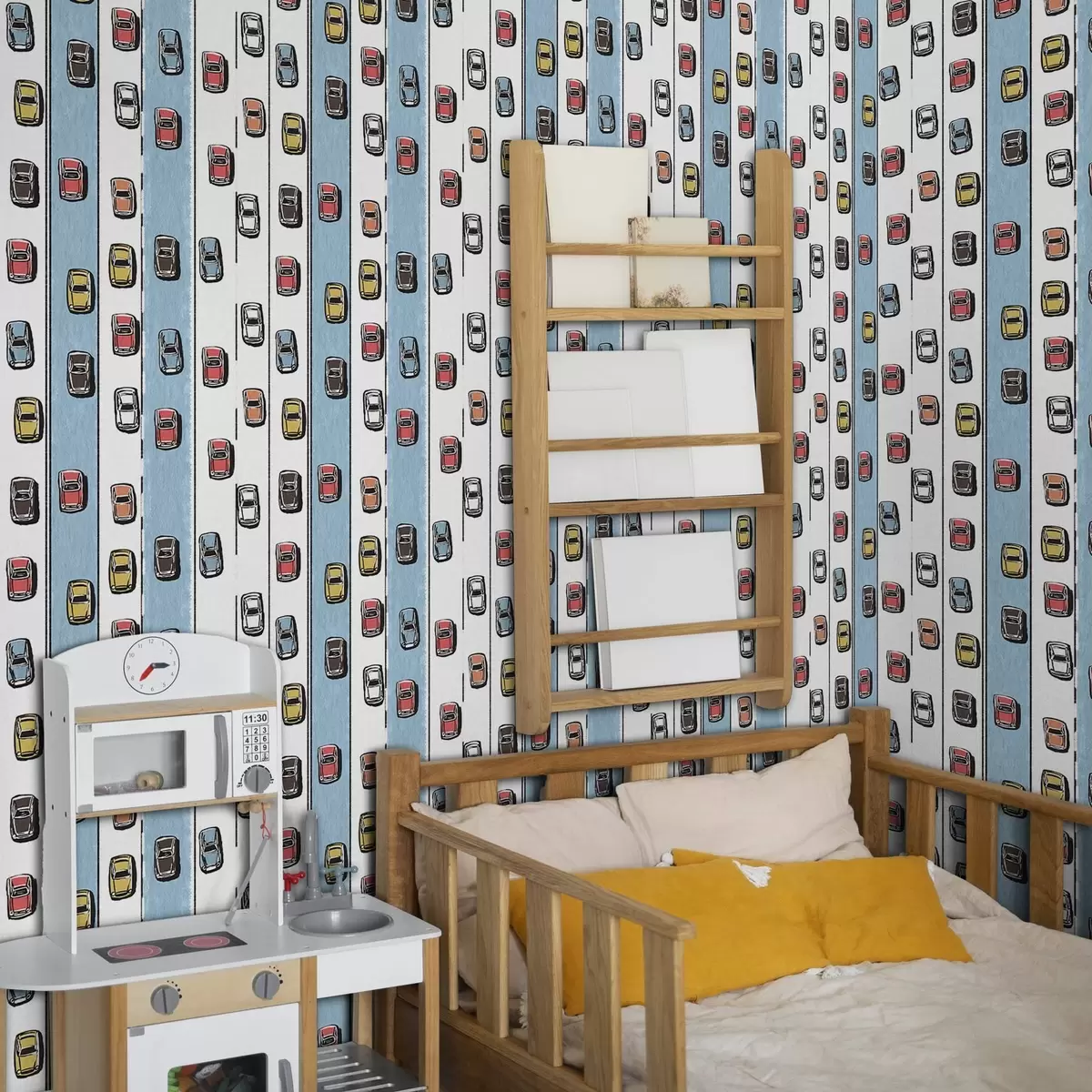 Papel tapiz Coche retro en una carretera blanca y azul al estilo de los años 60 Nr. a00118v2