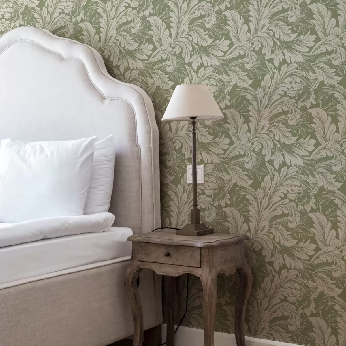 Papel tapiz Barroco con hojas crema sobre fondo verde Nr. a00135