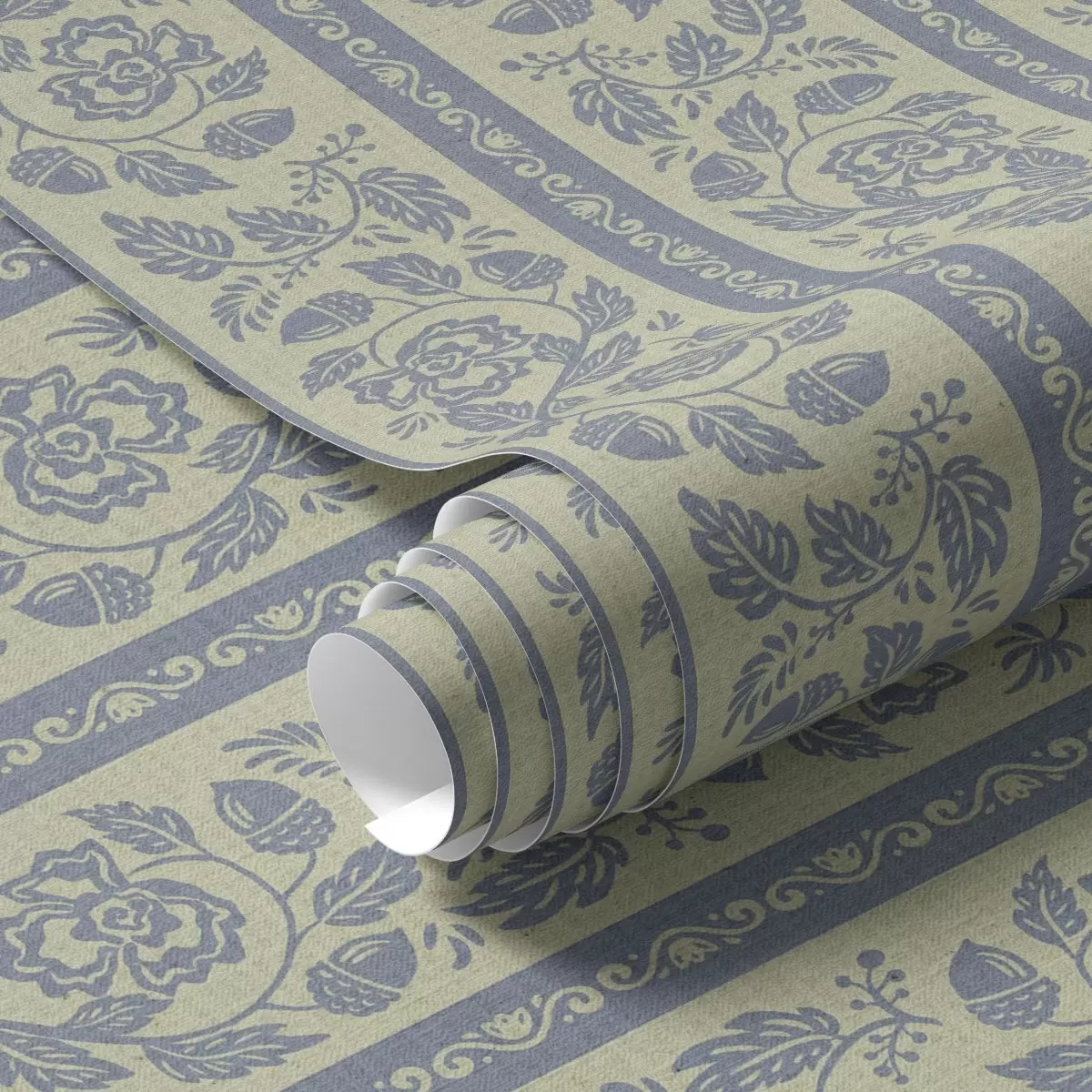 Papel tapiz Adorno floral a rayas con bellotas en tonos azules y beige Nr. a00181