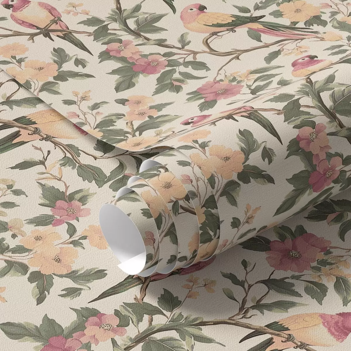 Papel tapiz Pájaros tropicales sobre ramas floridas en colores pastel Nr. a00199