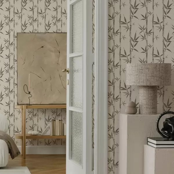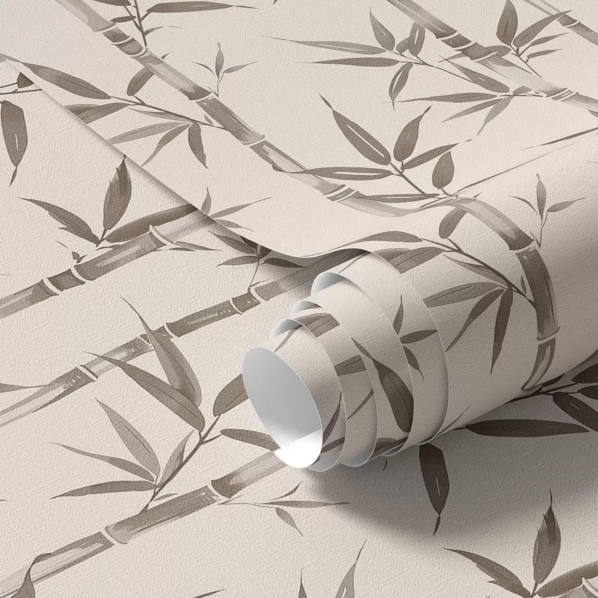 Papel tapiz Estampado de bambú beige con hojas de estilo japonés Nr. a00236