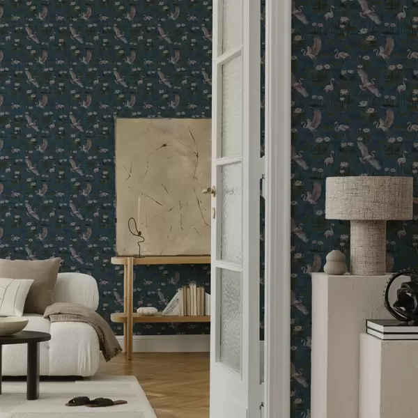 Papel tapiz Flamenco entre nenúfares, escena tropical sobre fondo azul marino Nr. a00237