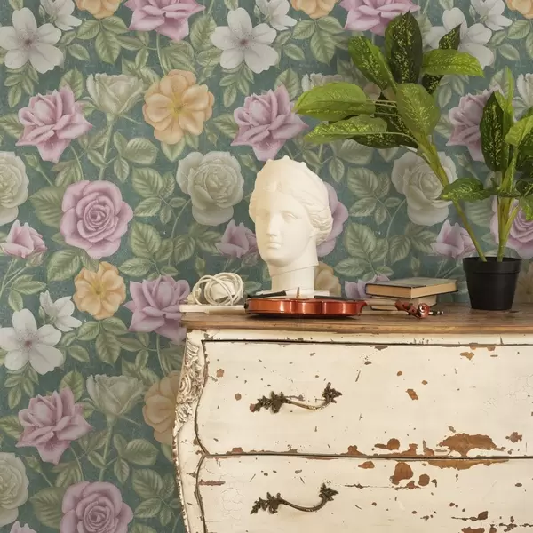 Papel pintado Crema rosa y rosas amarillas sobre fondo verde a00300