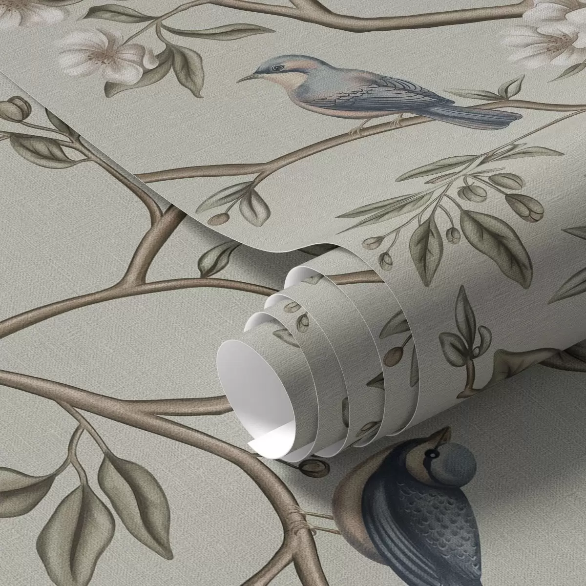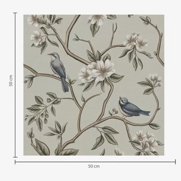Papel tapiz Ramas con pájaros y flores blancas sobre un fondo delicado Nr. a00303
