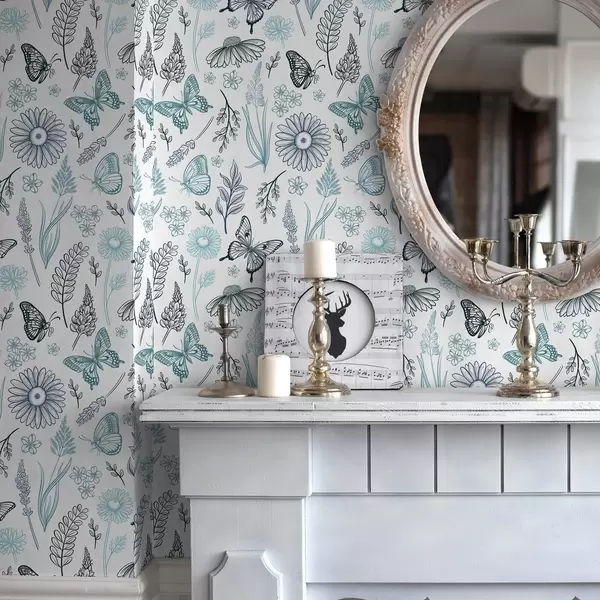 Papel tapiz Contorno de mariposas y flores en tonos azules y celestes Nr. a00311