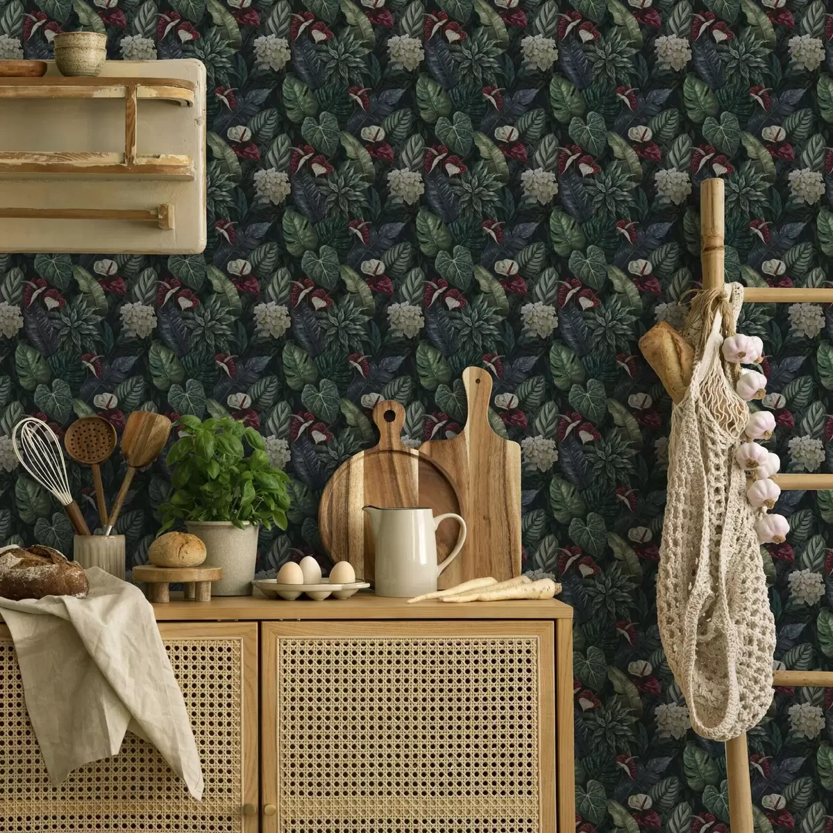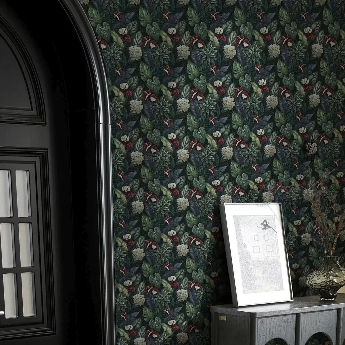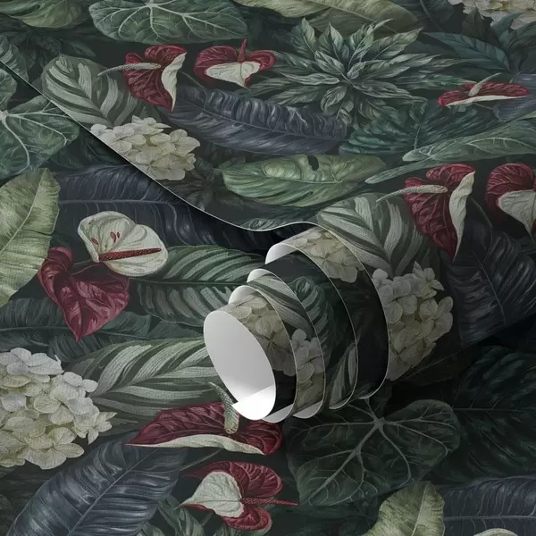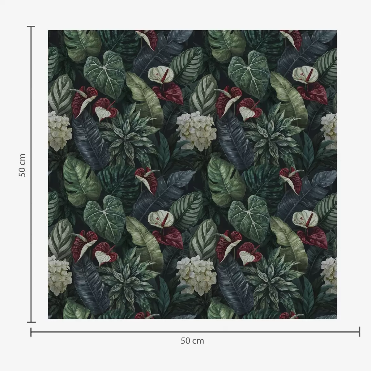 Papel tapiz Hojas tropicales con flores blancas y rojas Nr. a00361