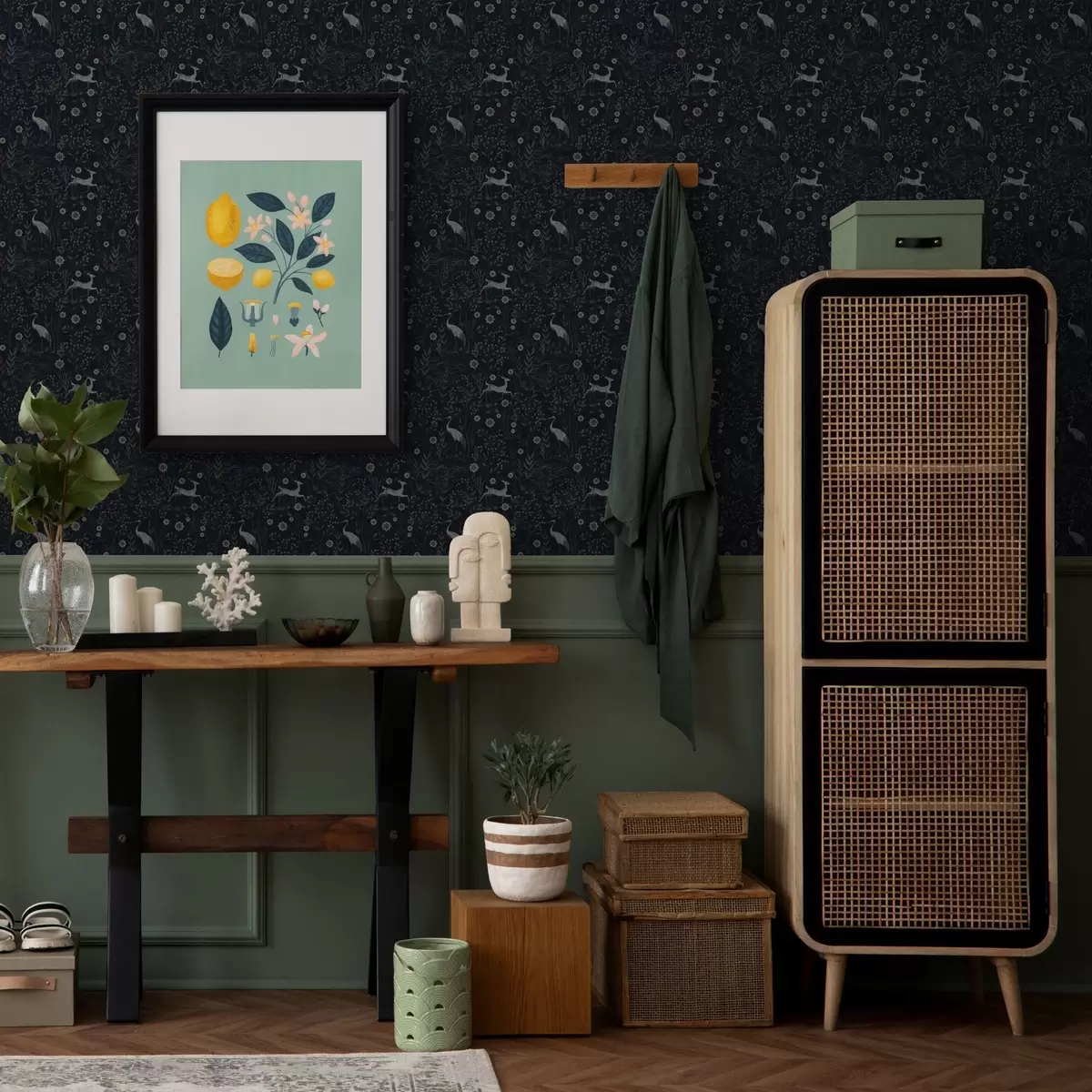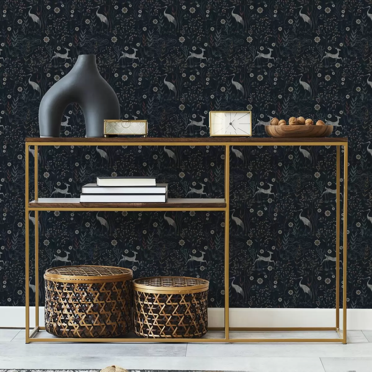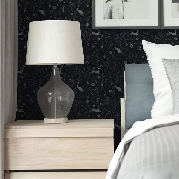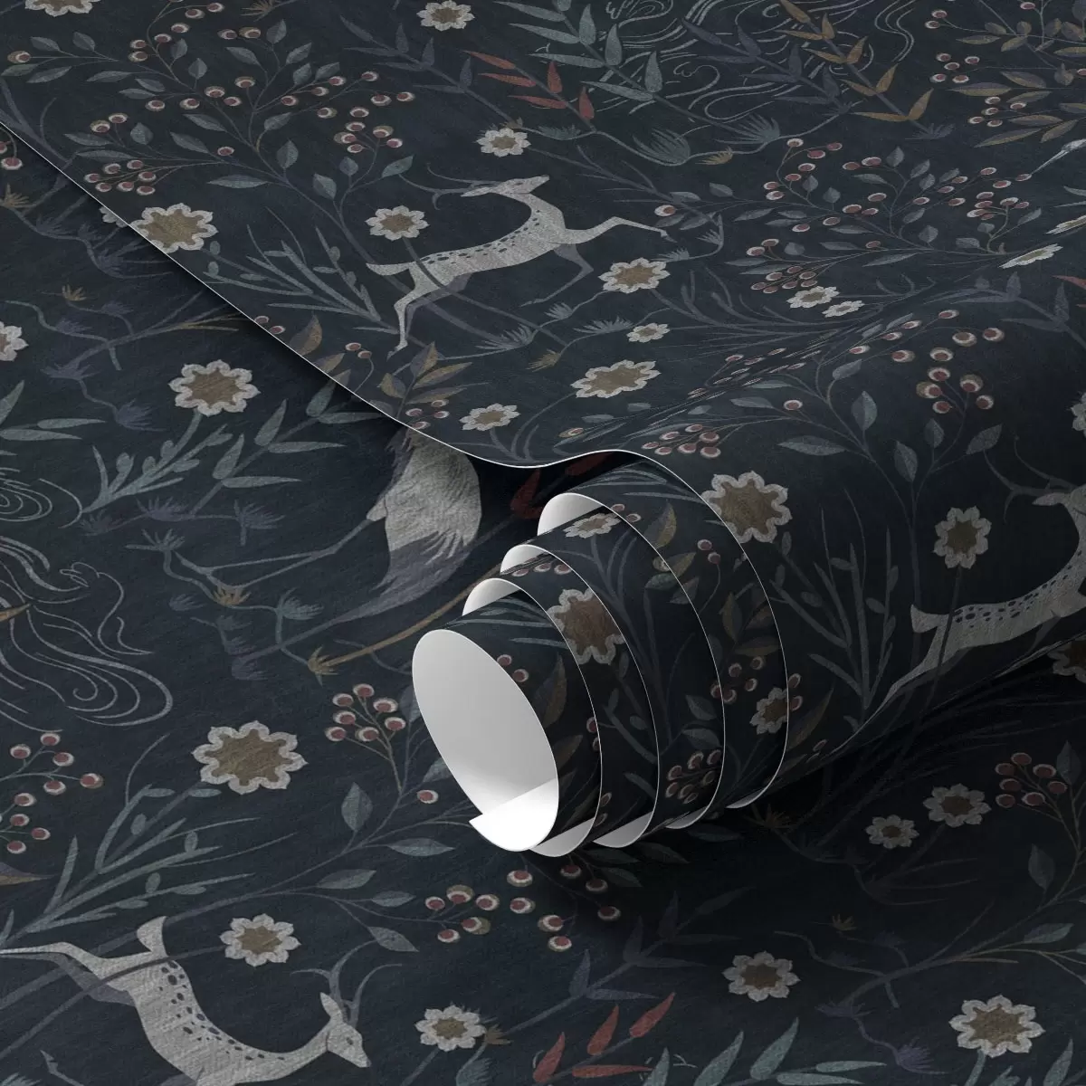 Papel tapiz Fondo oscuro con pájaros y ciervos blancos Nr. a00363