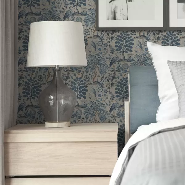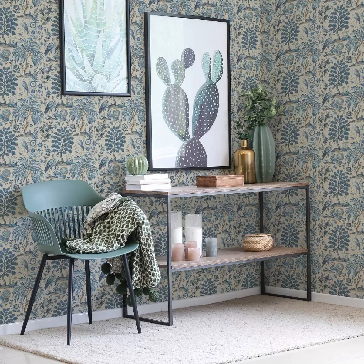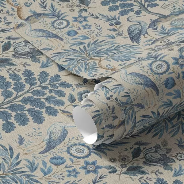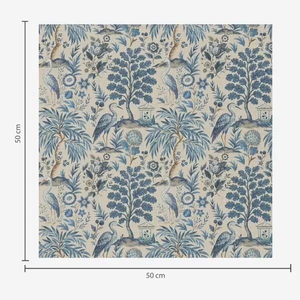 Papel tapiz Toile de Jouy con pájaros azules y árboles tropicales Nr. a00382