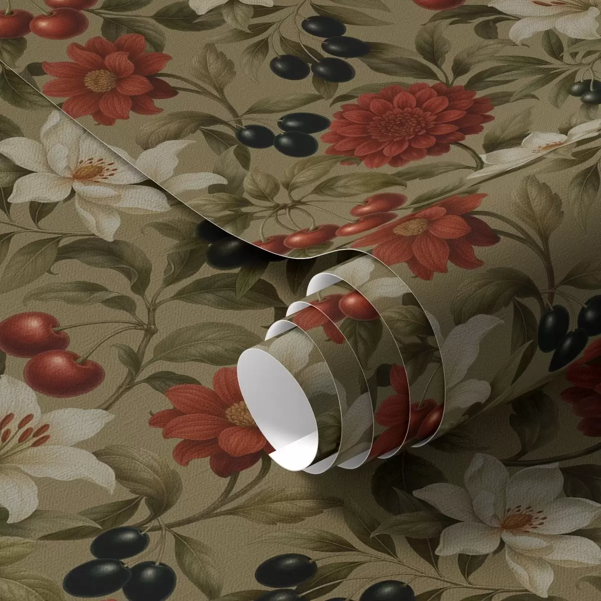 Papel tapiz Cerezas, flores y aceitunas negras Nr. a00384