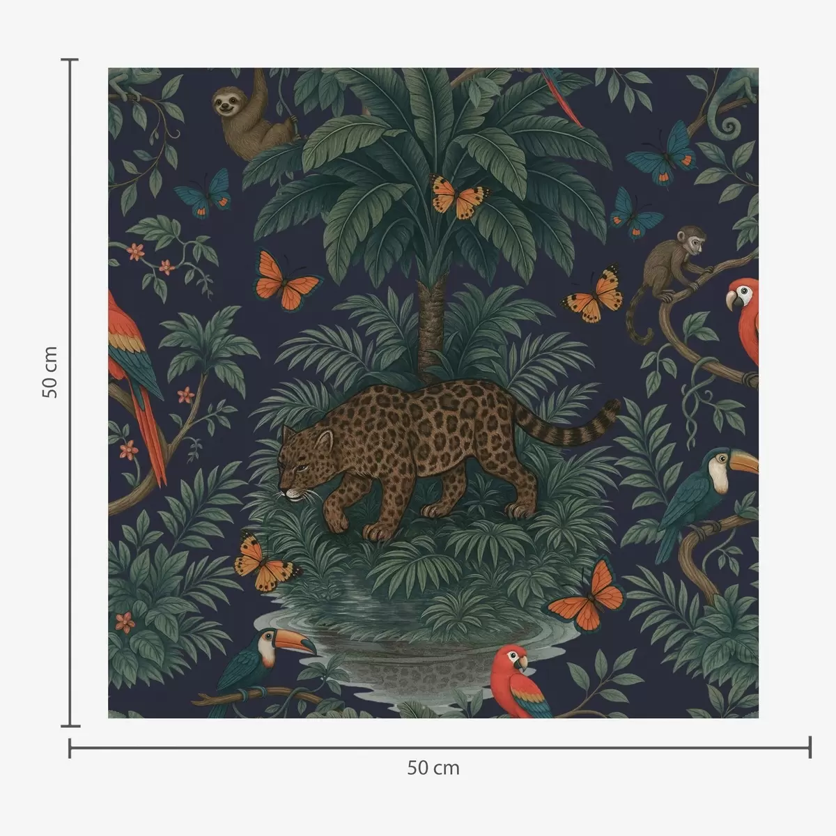 Papel tapiz Selva tropical con leopardo, leopardo, loros y mariposas Nr. a00388