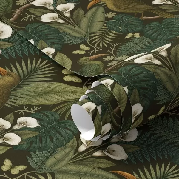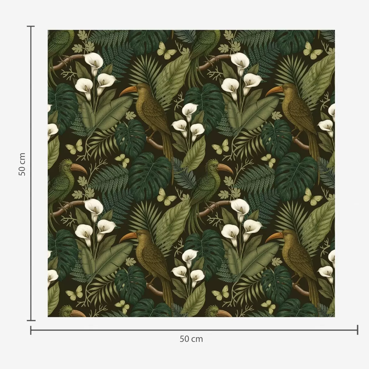 Papel tapiz Aves tropicales y exuberante vegetación sobre fondo oscuro de selva Nr. a00397