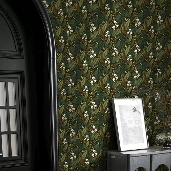 Papel tapiz Aves tropicales y exuberante vegetación sobre fondo oscuro de selva Nr. a00397