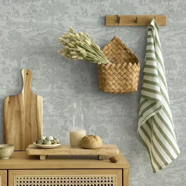 Papel pintado Paisaje verde monocromo con caballos y casitas de campo a00407