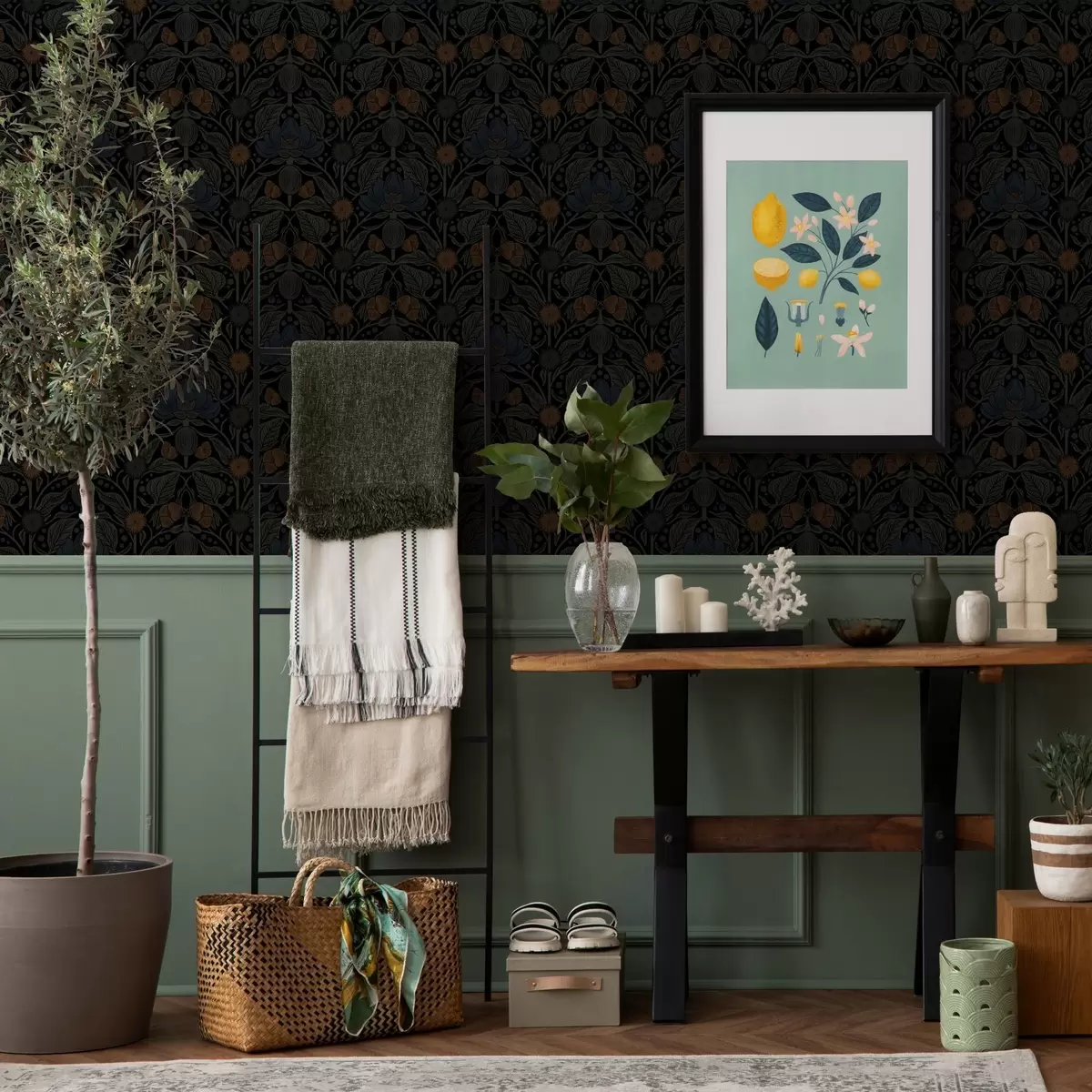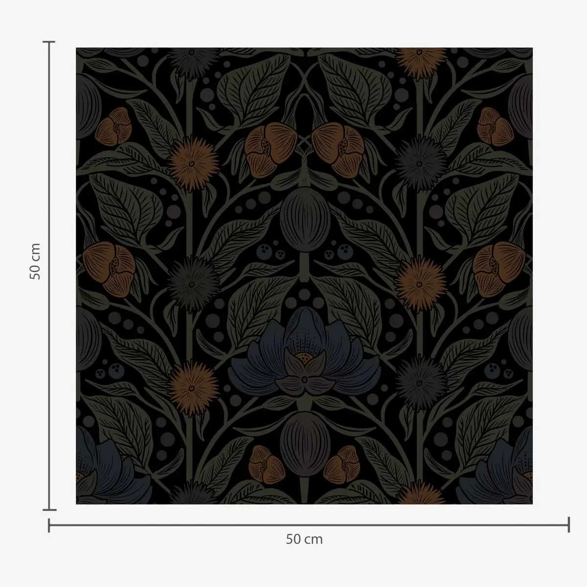 Papel tapiz Adorno floral oscuro con detalles naranjas Nr. a00411