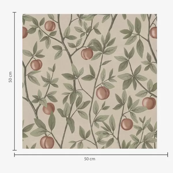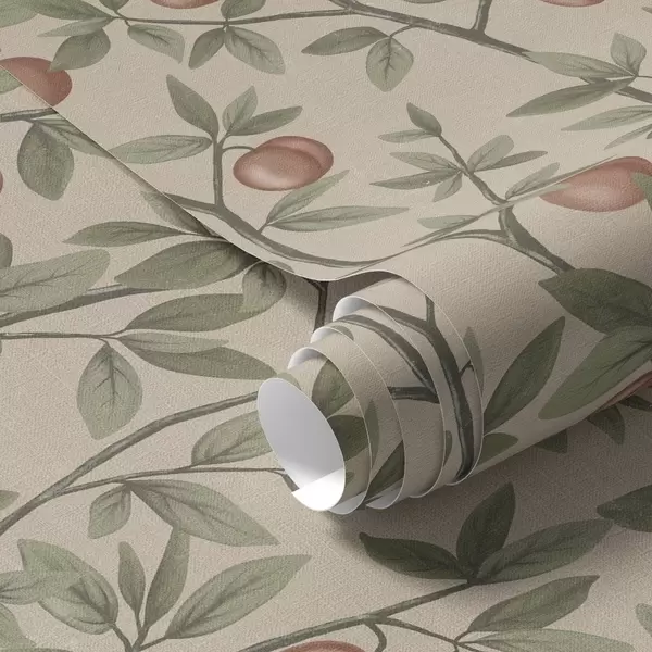 Papel tapiz Melocotones en ramas con hojas verdes sobre fondo beige Nr. a00429