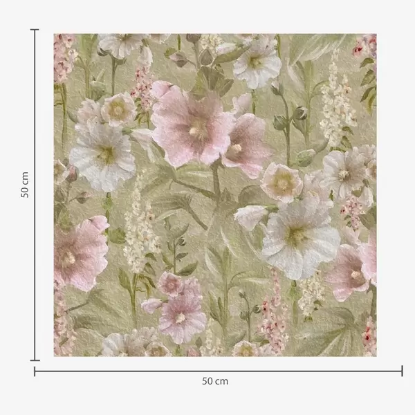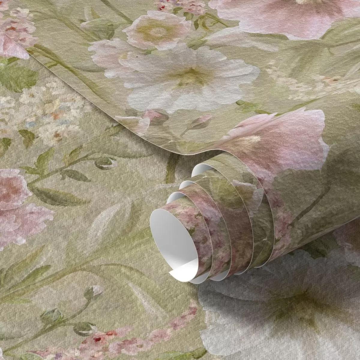 Papel tapiz Románticas malvarrosas rosas y blancas sobre un verde apagado Nr. a00456