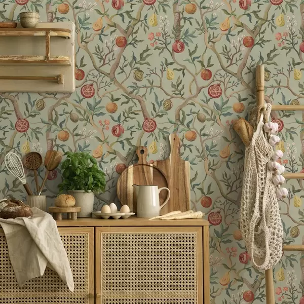 Papel tapiz Granadas, peras y flores sobre fondo verde pálido Nr. a00465