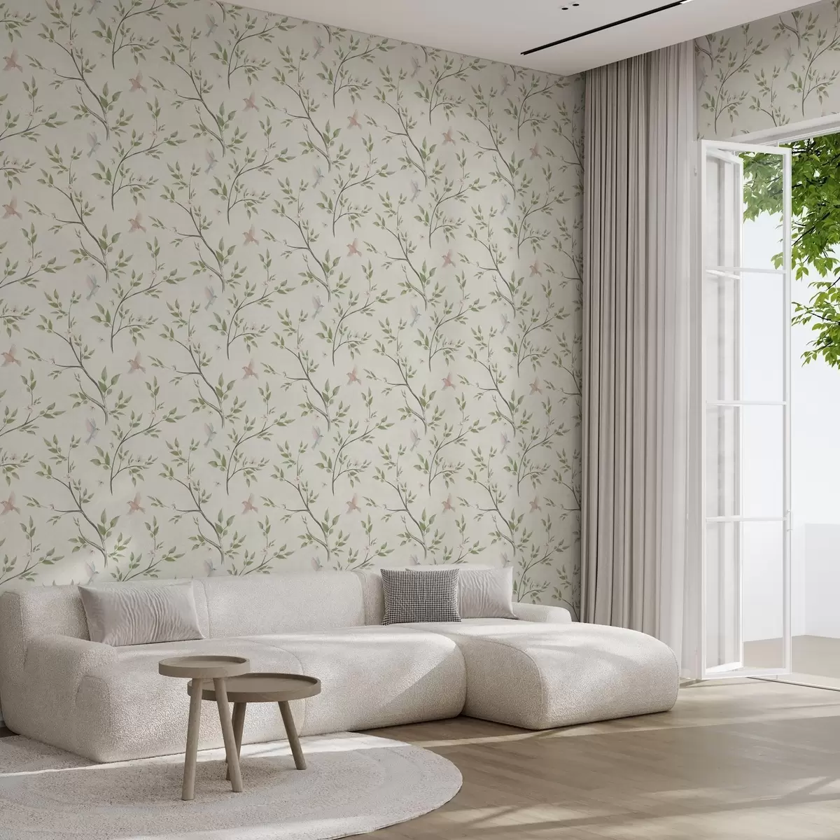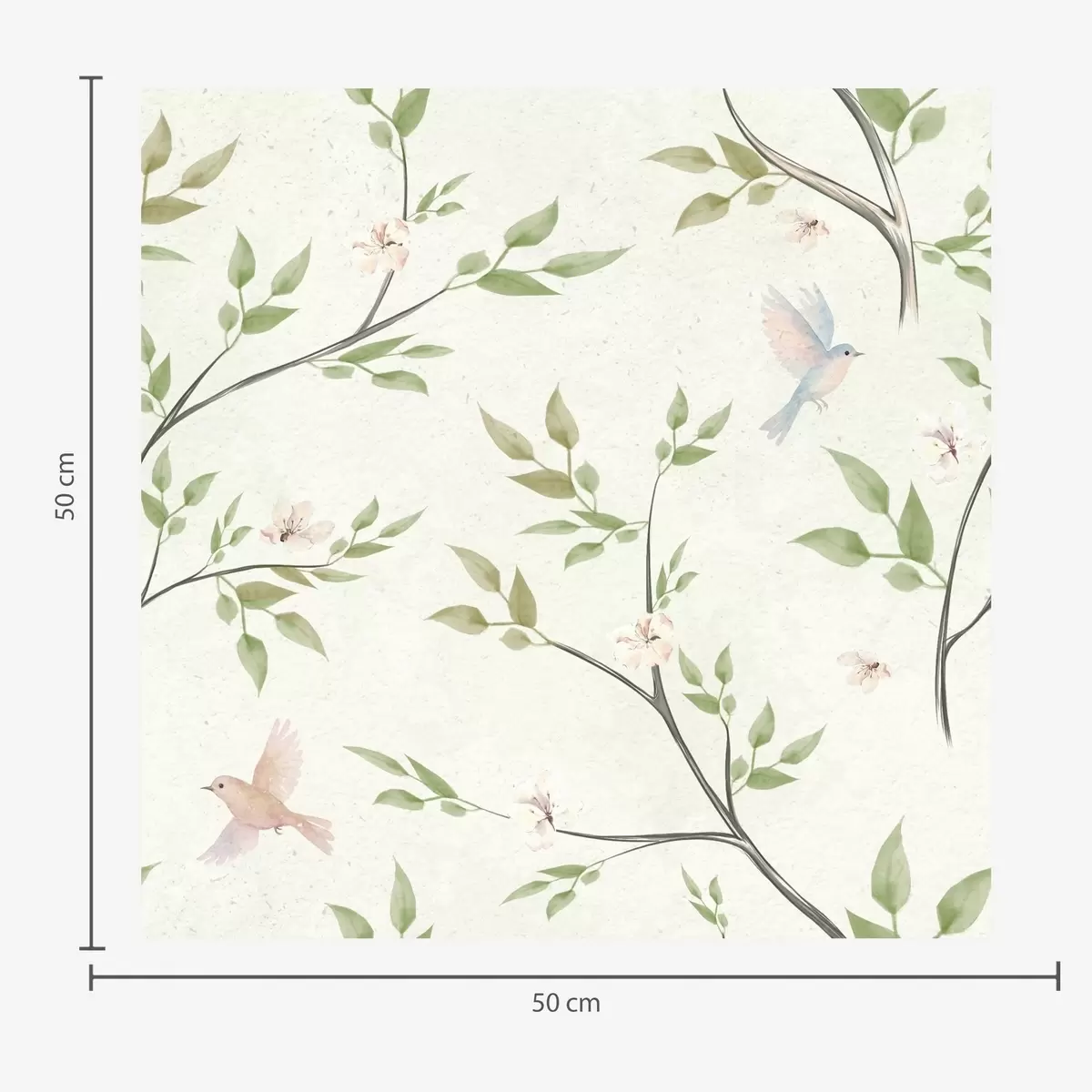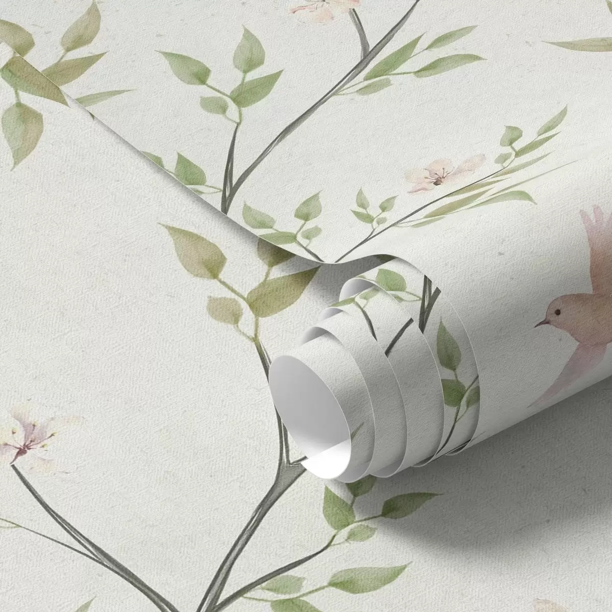 Papel tapiz Ramas acuareladas con hojas y pájaros sobre un fondo claro Nr. a00496