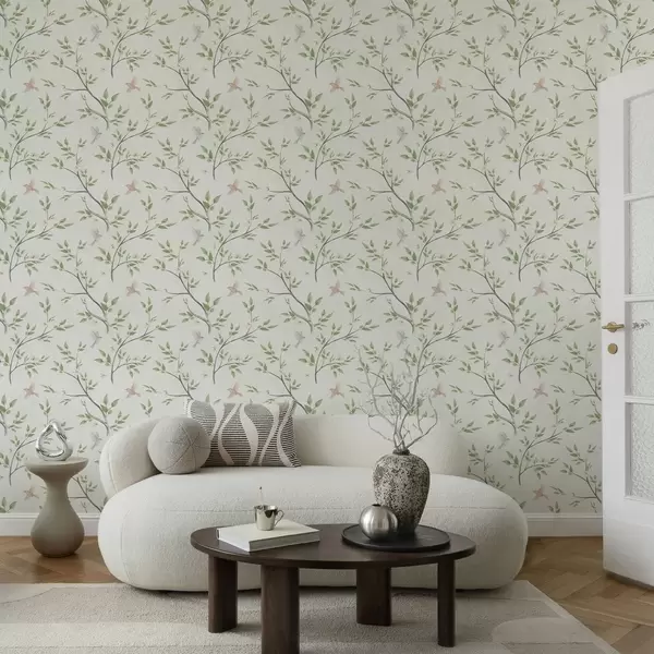 Papel tapiz Ramas acuareladas con hojas y pájaros sobre un fondo claro Nr. a00496