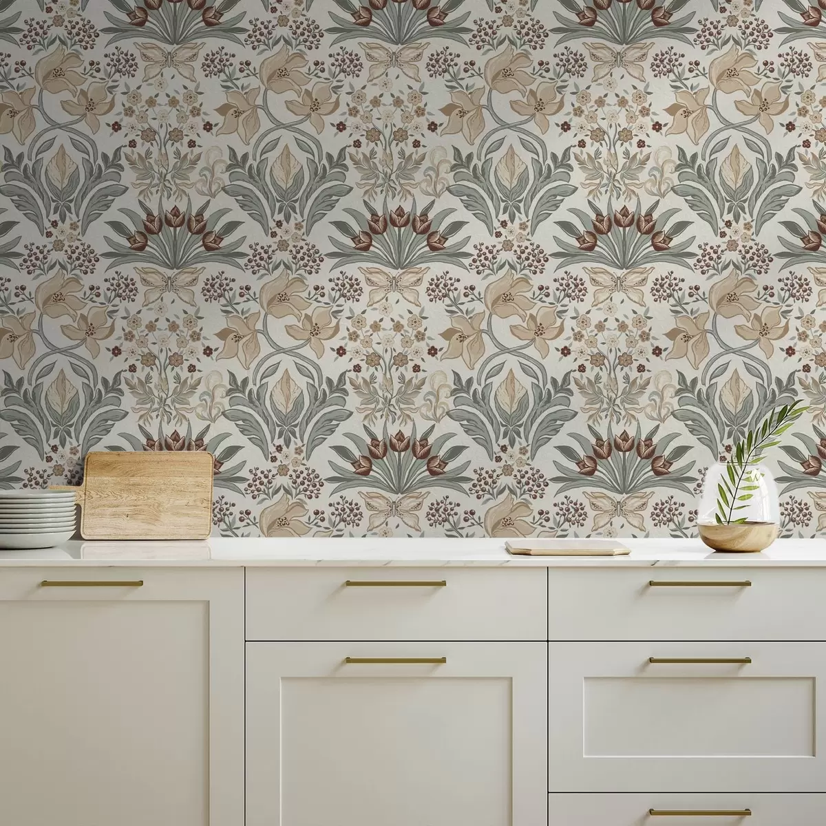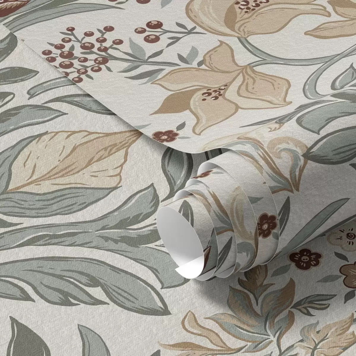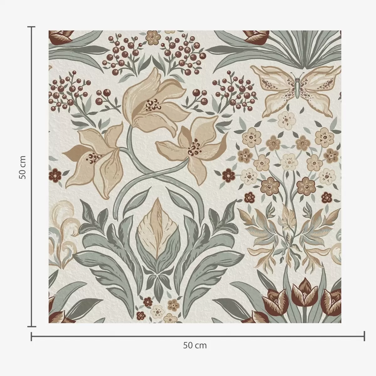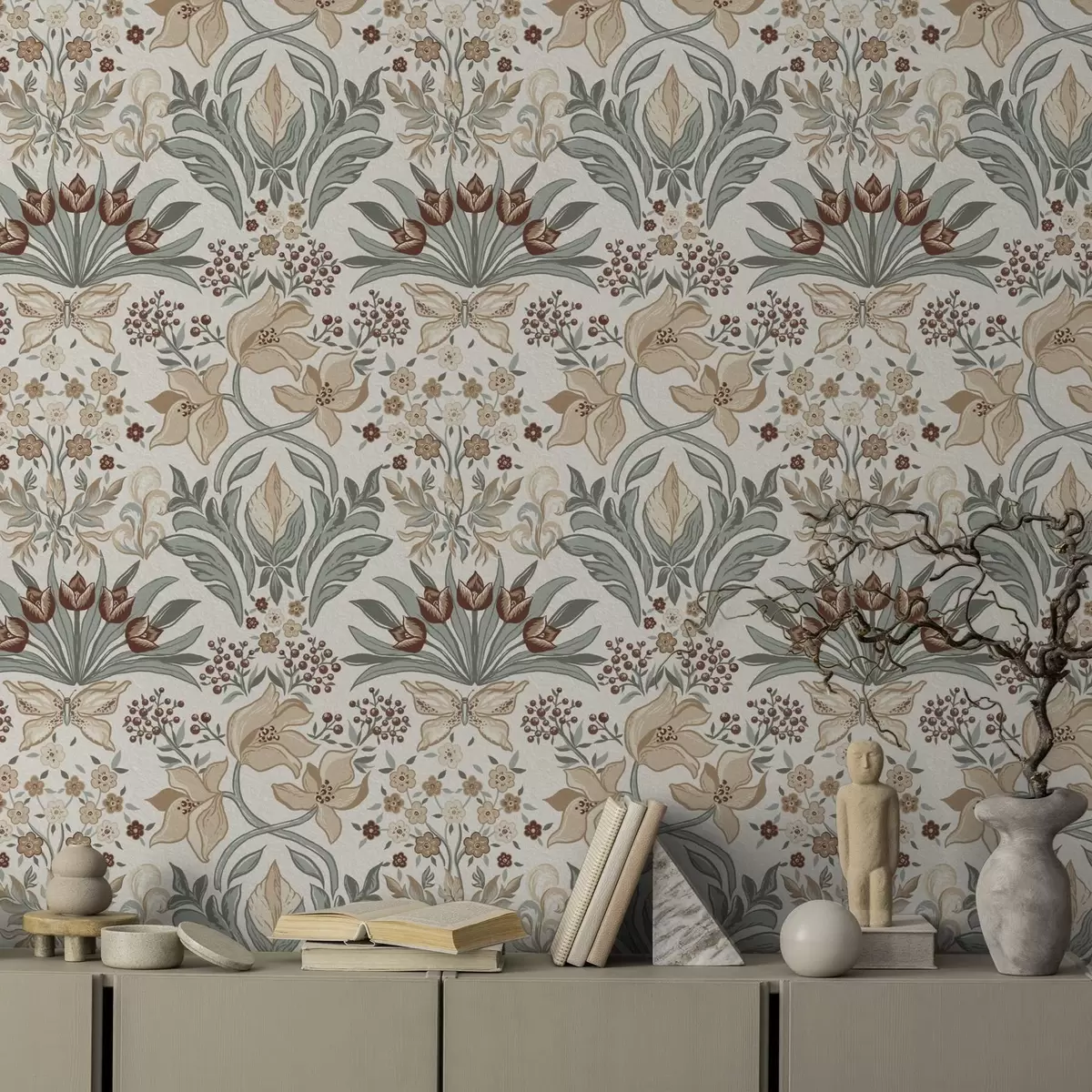 Papel tapiz Lirios decorativos y una mariposa sobre fondo crema Nr. a00500