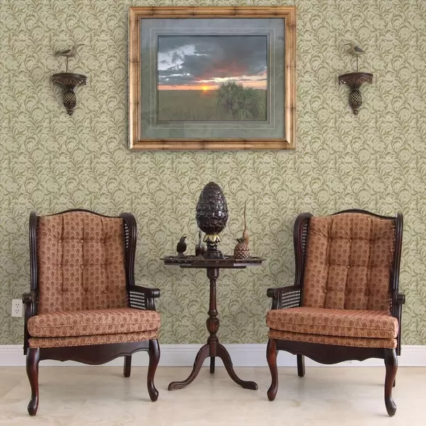Papel tapiz Adorno vintage con volutas y flores, beige y oliva Nr. a00574
