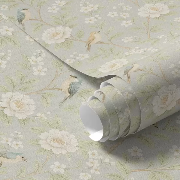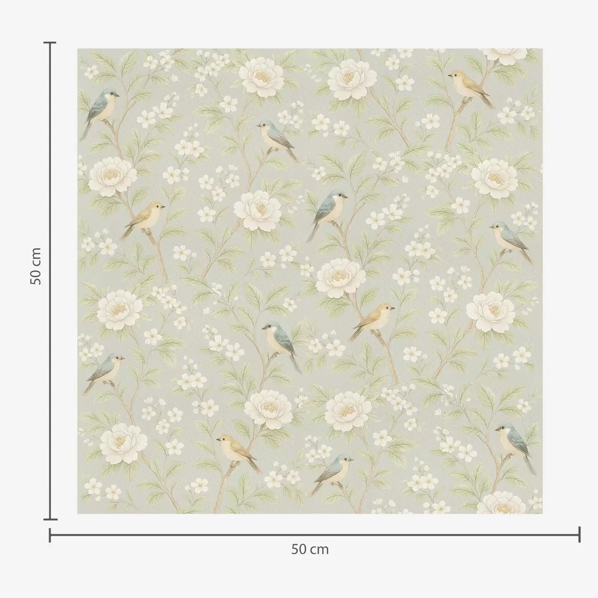 Papel tapiz Pájaros entre flores blancas sobre un fondo gris verdoso Nr. a00583