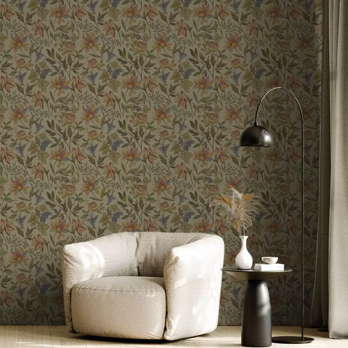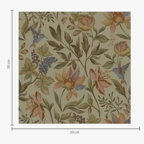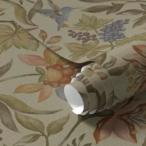 Papel tapiz Flores y pájaros vintage con uvas sobre fondo oliva Nr. a00594