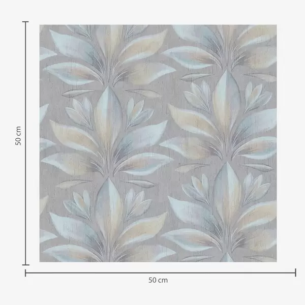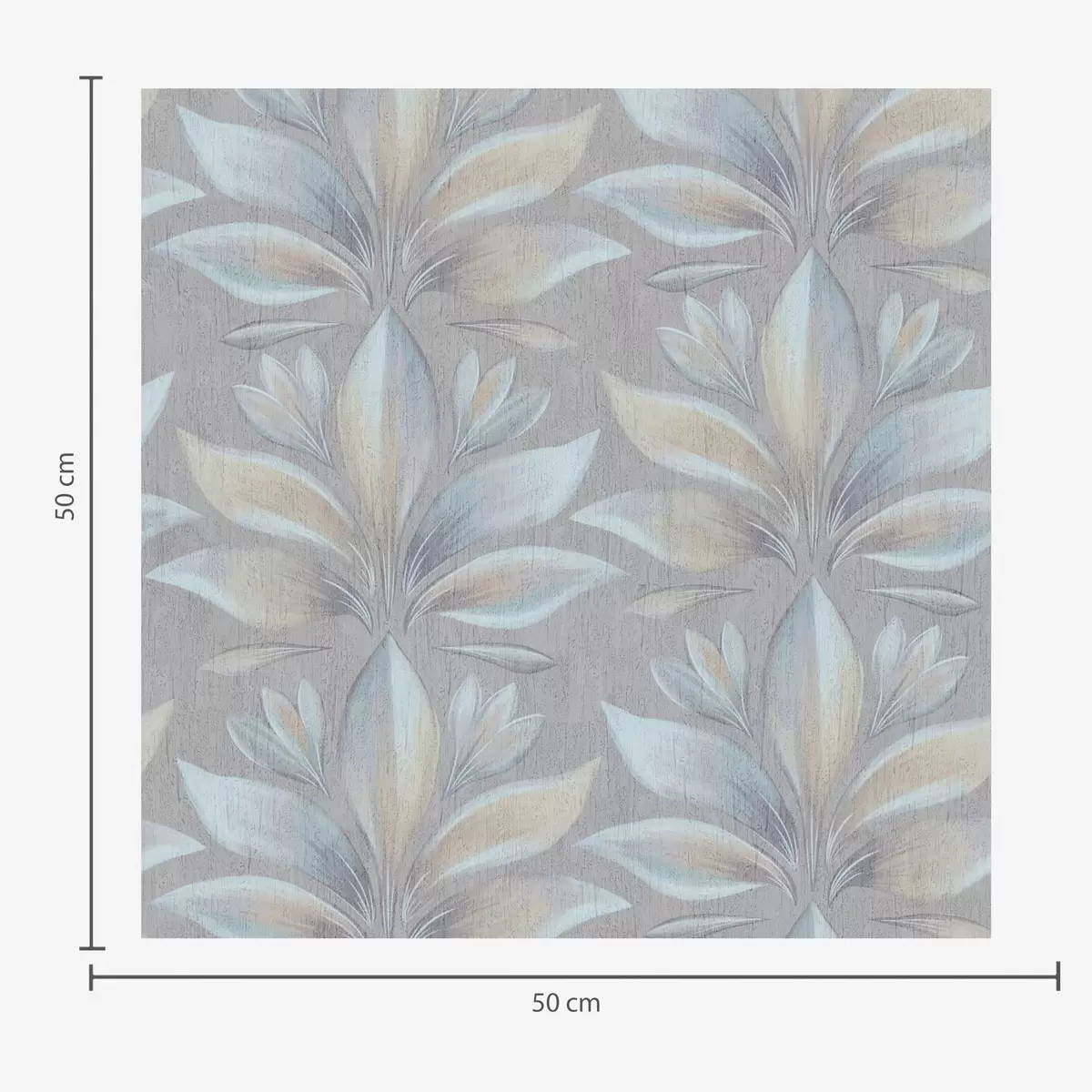 Papel tapiz Grandes hojas estilizadas en una paleta de colores azul arena sobre fondo gris Nr. a00601