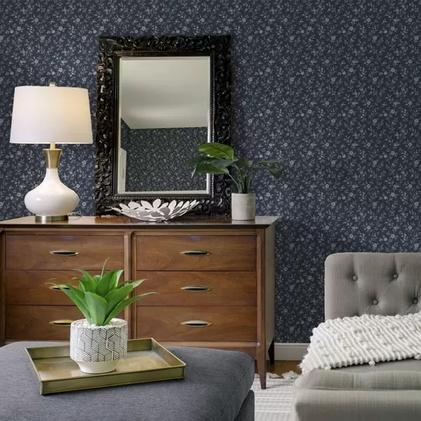 Papel pintado Fondo azul marino oscuro con finas ramas y flores de color beige a00612
