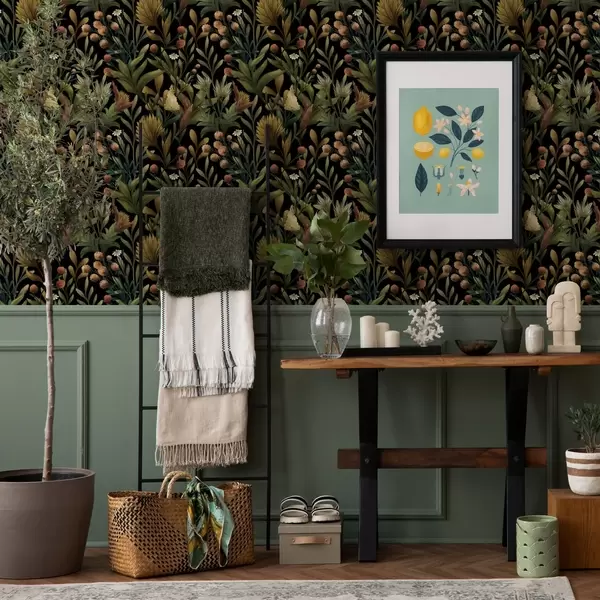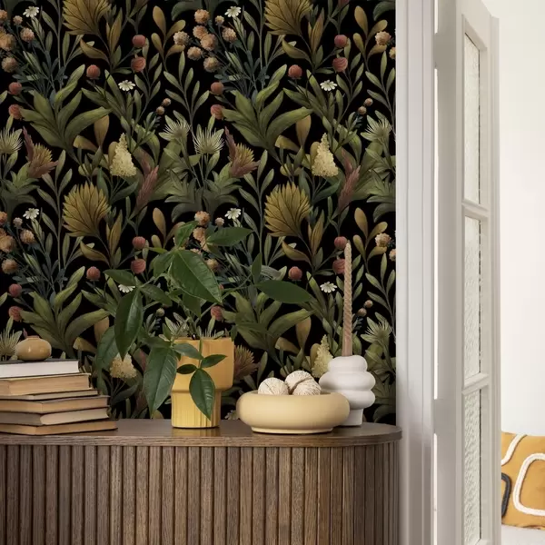 Papel tapiz Jardín botánico sobre fondo negro, cálida paleta otoñal Nr. a00619