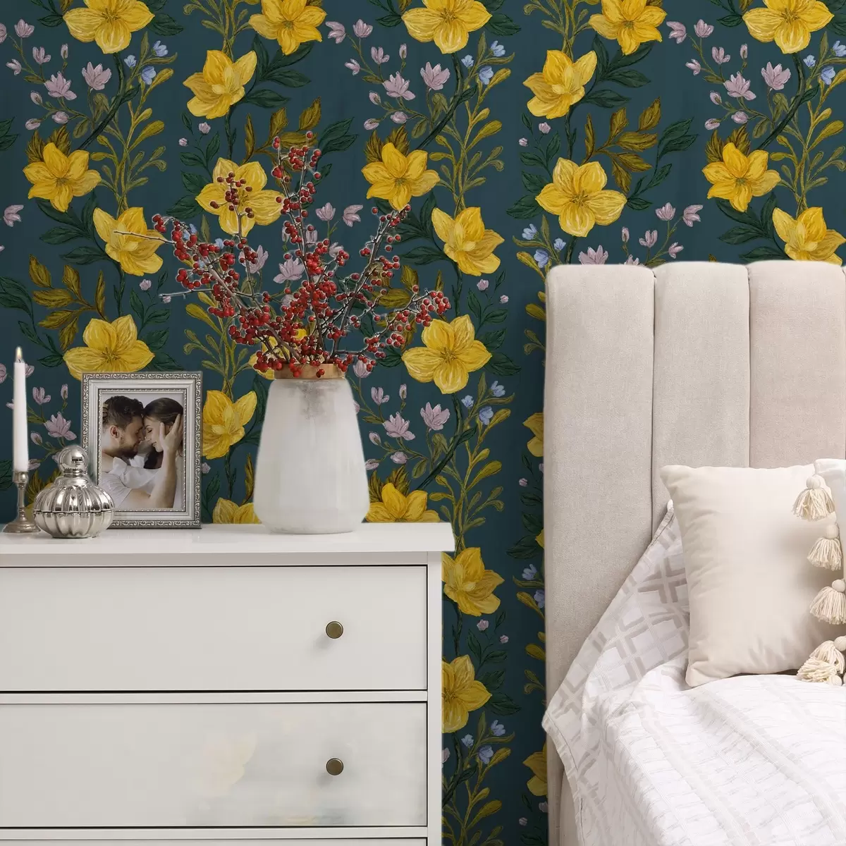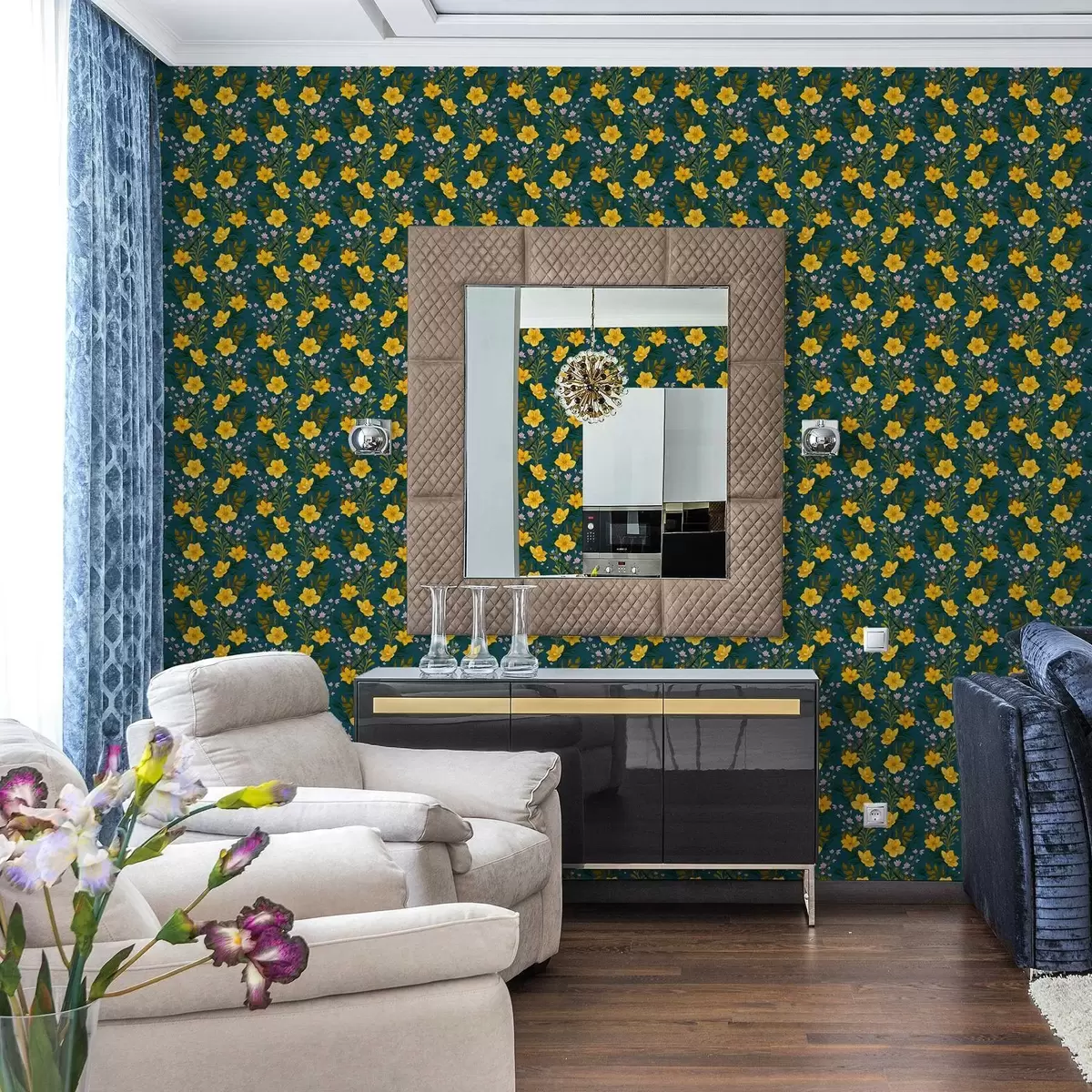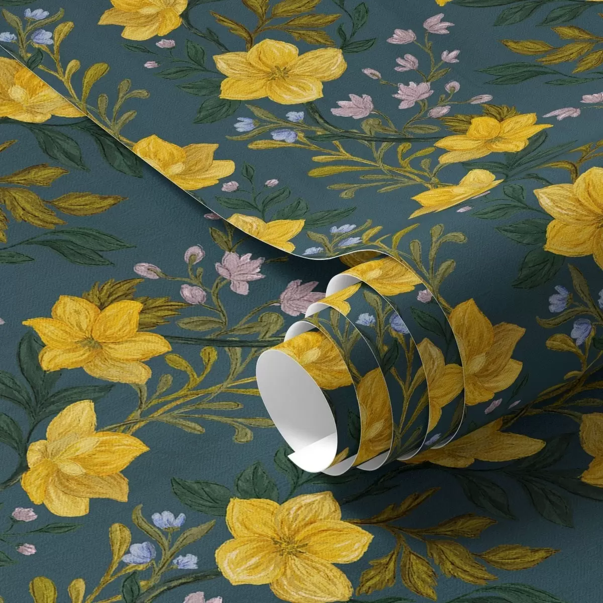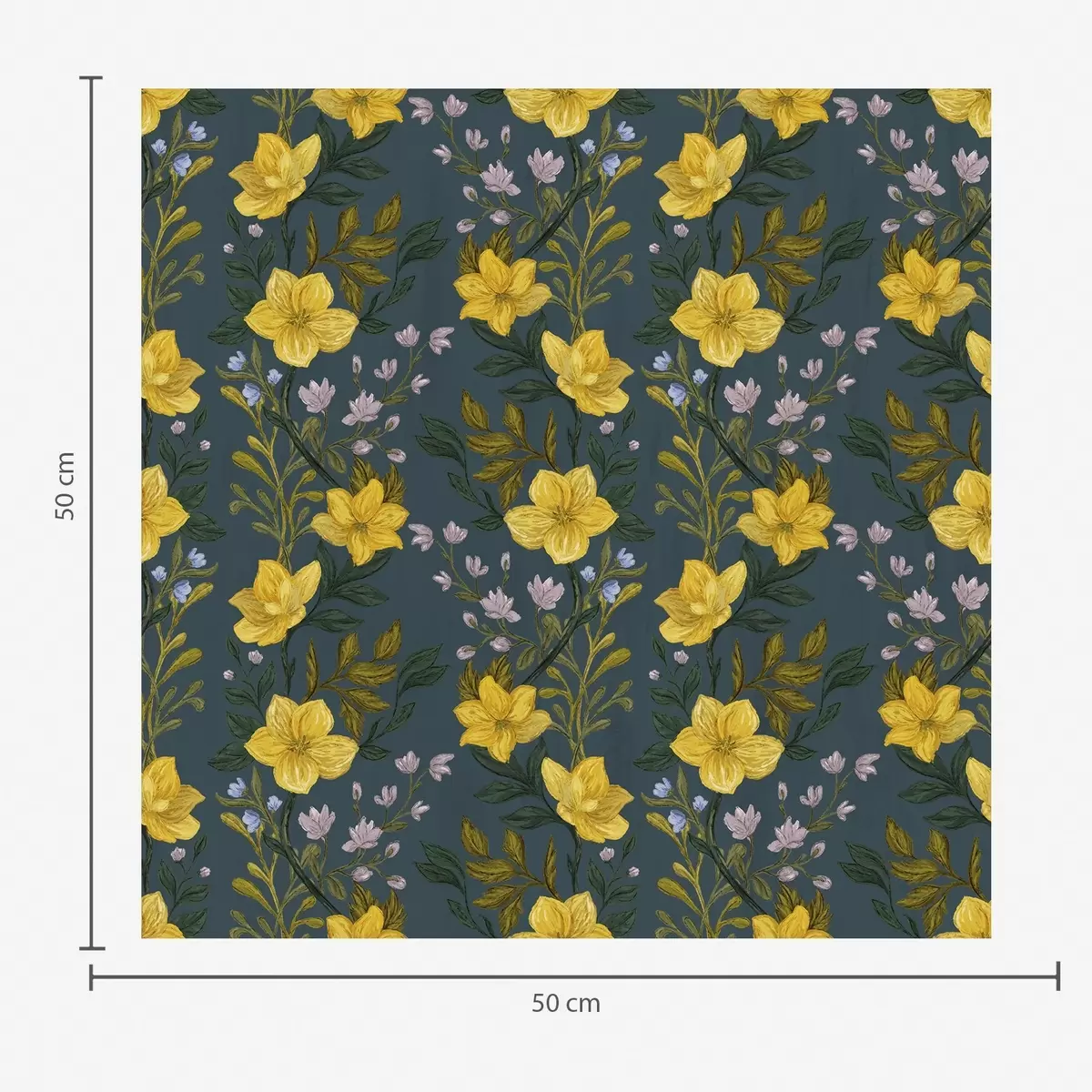 Papel tapiz Flores amarillas en guirnaldas verticales sobre fondo azul oscuro Nr. a00632v2