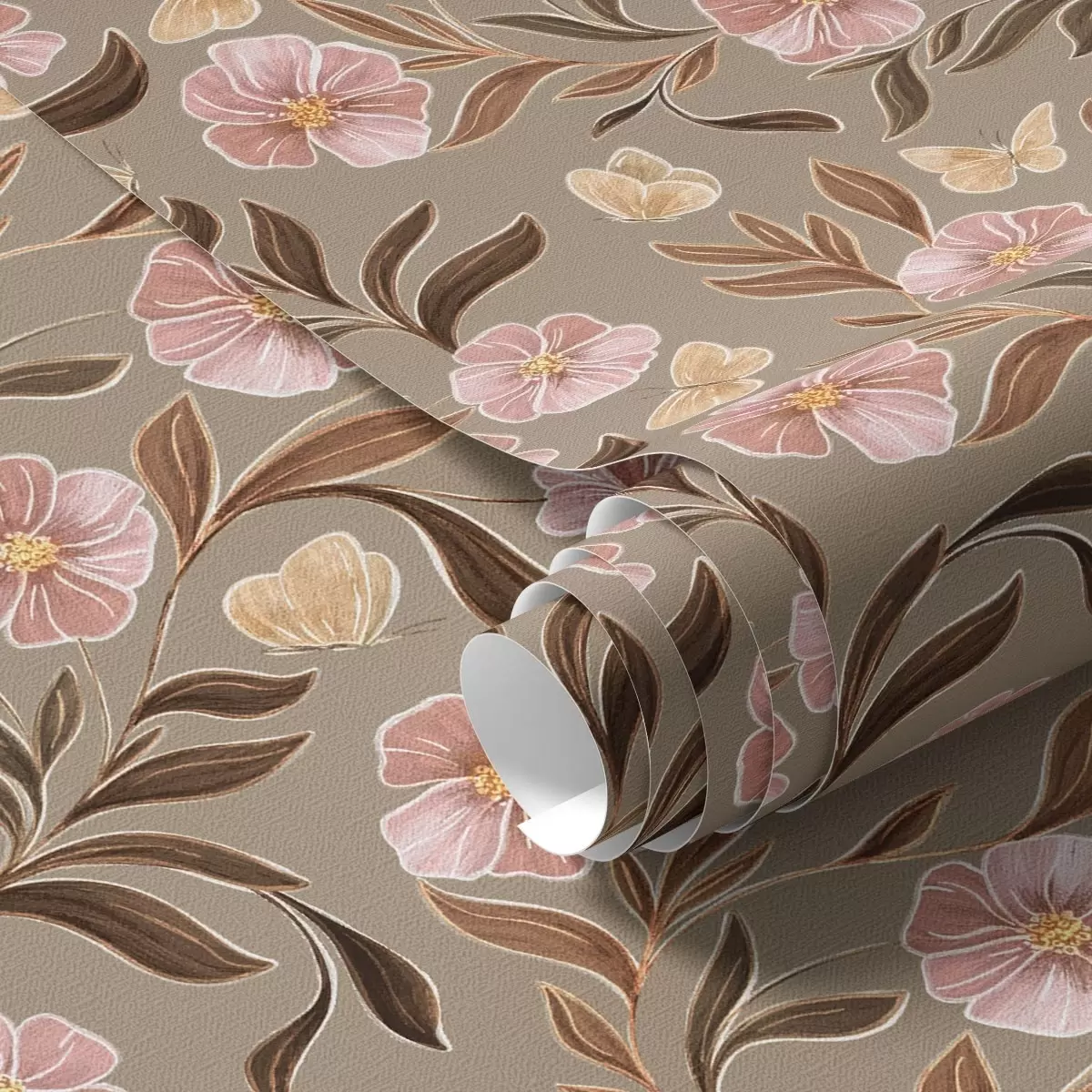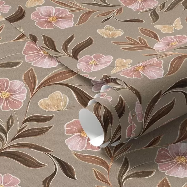 Papel pintado Flores rosas y mariposas sobre fondo beige oliva a00633v2