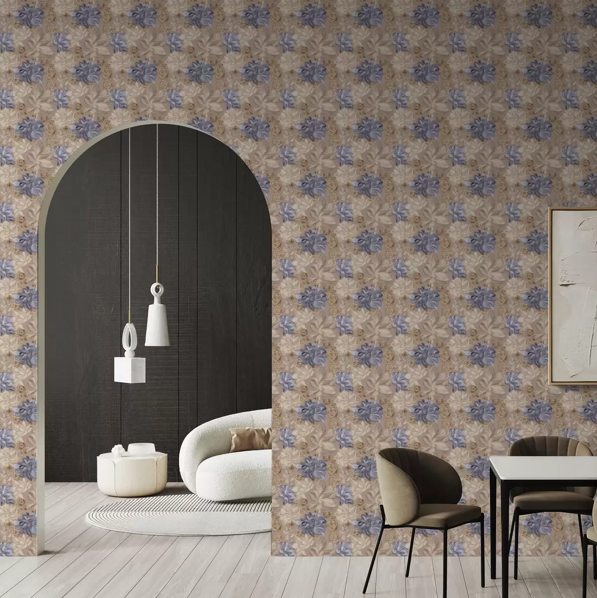 Papel tapiz Crema exuberante y flores azules en una paleta de colores pastel Nr. a00634