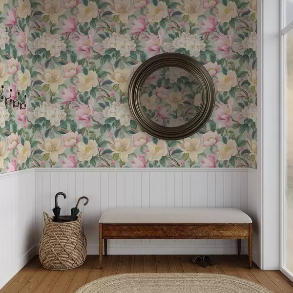 Papel tapiz Magnolias y flores blancas sobre fondo gris menta Nr. a00644