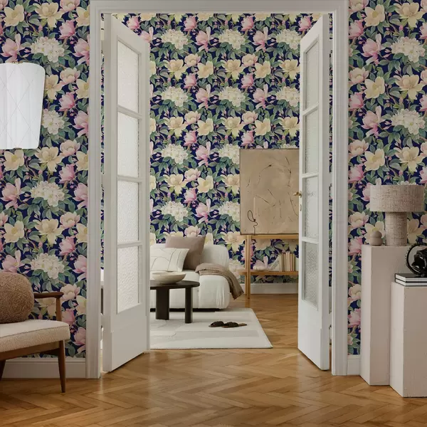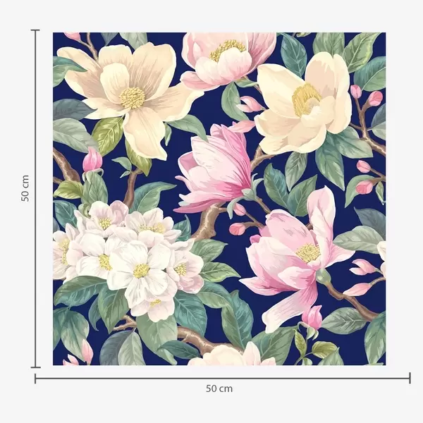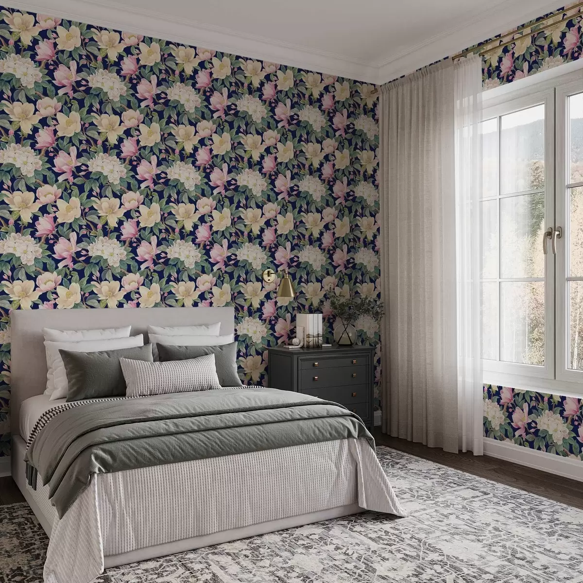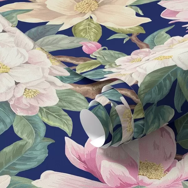Papel tapiz Magnolias y capullos sobre un fondo azul marino intenso Nr. a00644v1