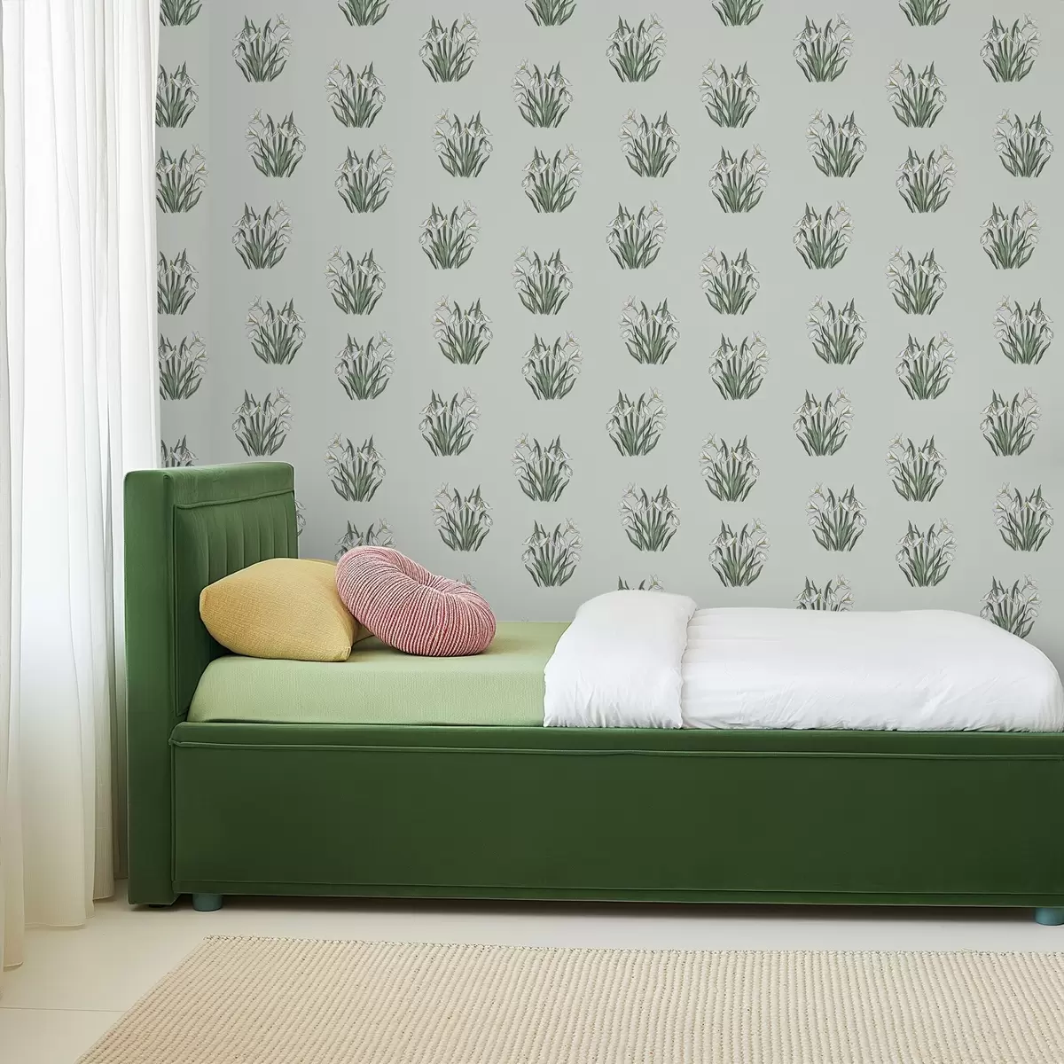 Papel tapiz Campanillas de invierno con hojas verdes sobre fondo verde pastel Nr. a00651