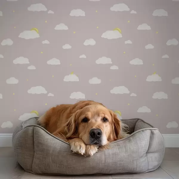 Papel tapiz Nubes suaves, estrellas y sol sobre un fondo gris rosáceo Nr. a00652v2