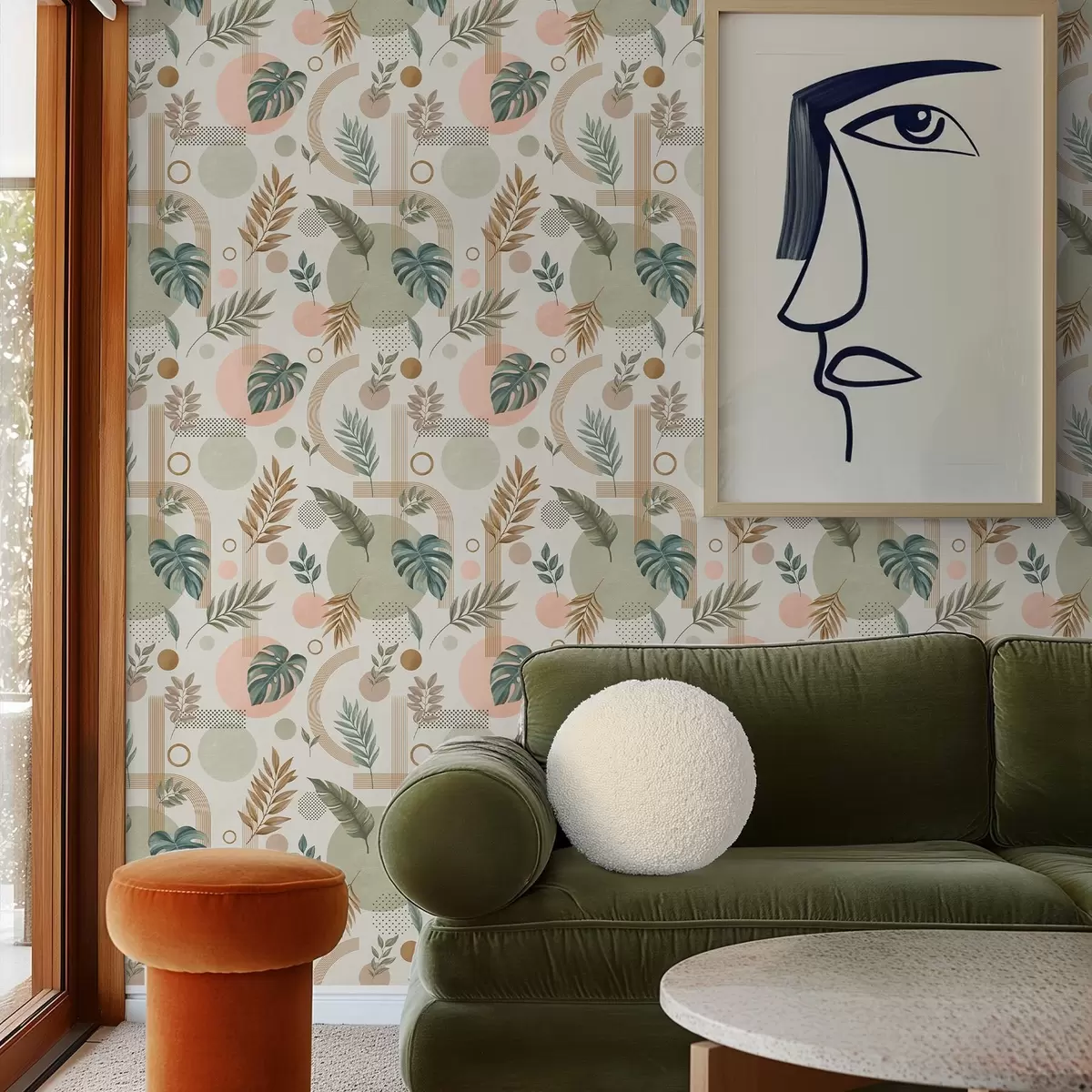 Papel tapiz Hojas y formas geométricas en tonos cálidos y tranquilos Nr. a00677