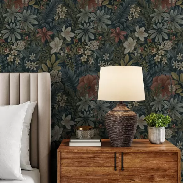 Papel tapiz Fondo oscuro con densas flores y hojas en tonos cálidos Nr. a00678