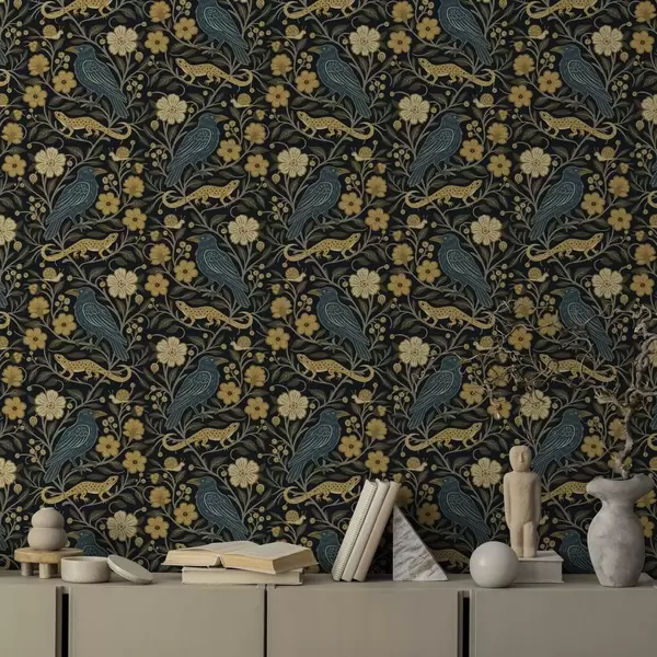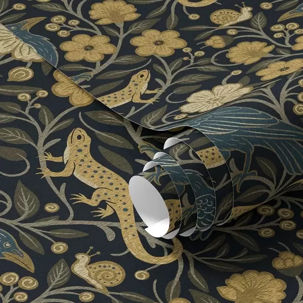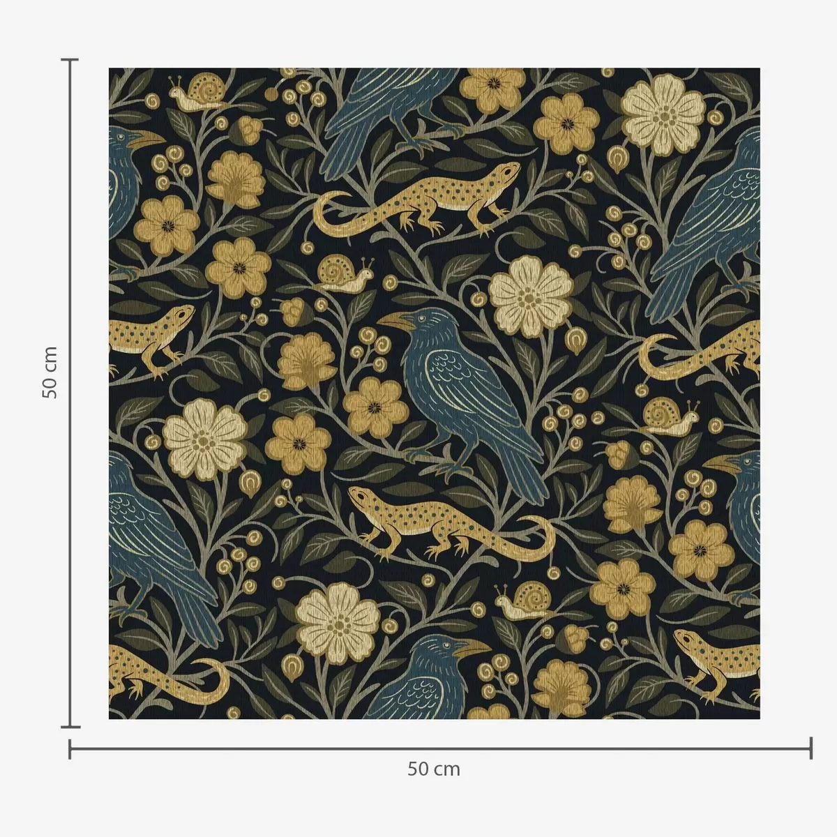 Papel tapiz Pájaros, lagartos y caracoles entre flores sobre un fondo oscuro Nr. a00691