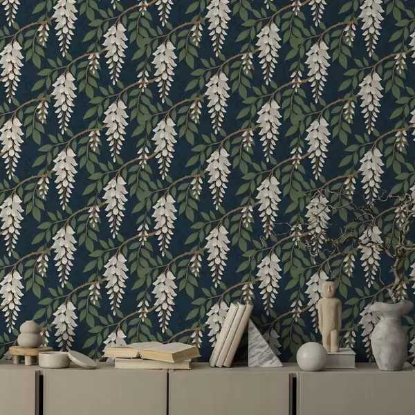 Papel tapiz Glicinia marfil sobre fondo verde azulado intenso Nr. a00694v1