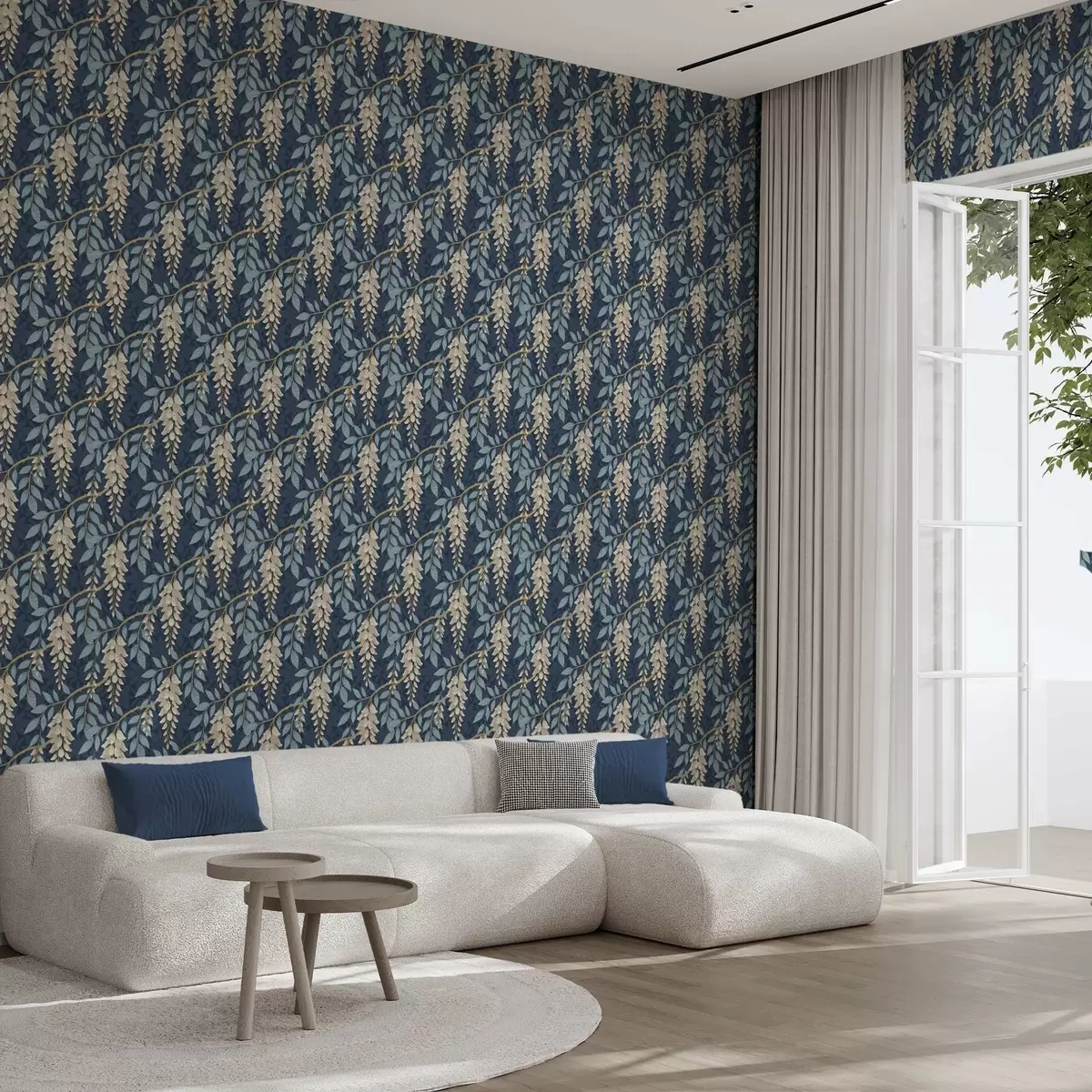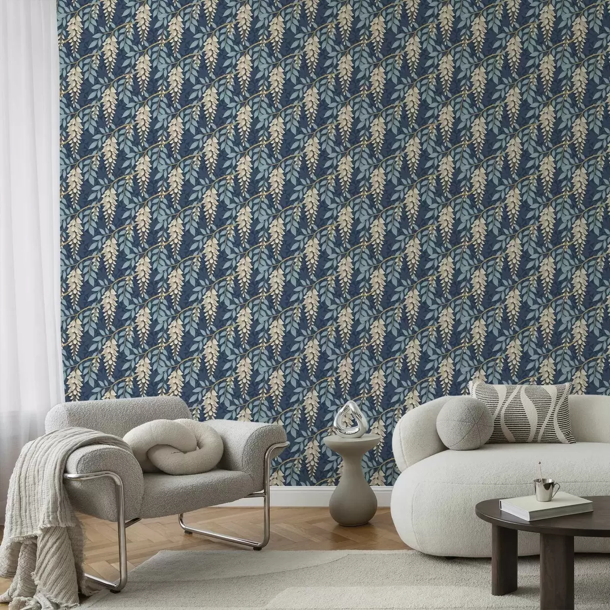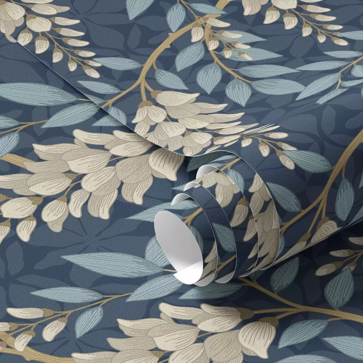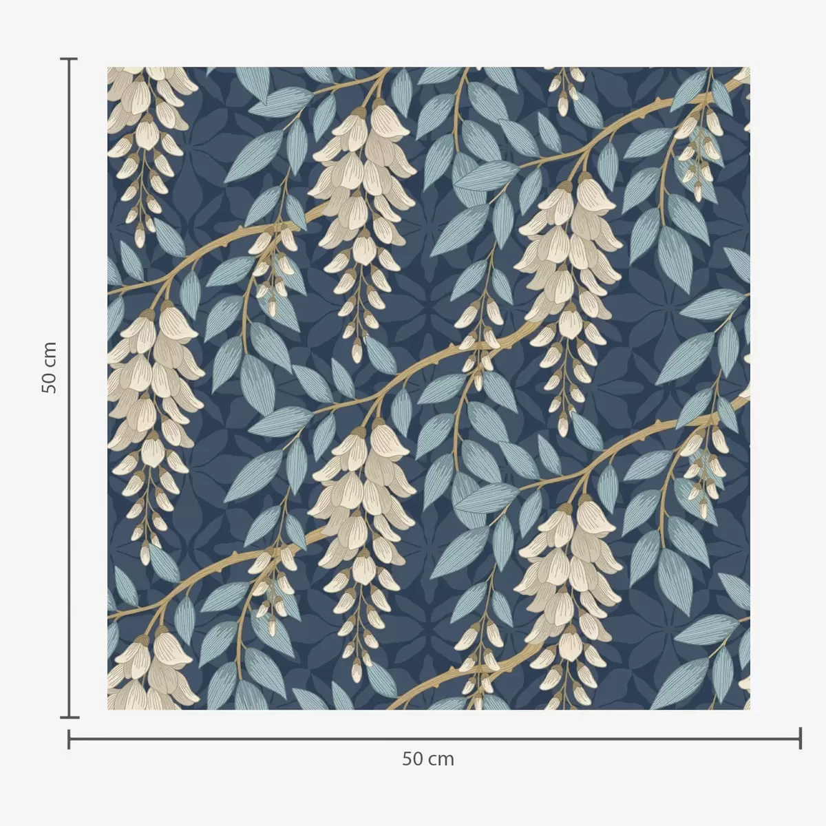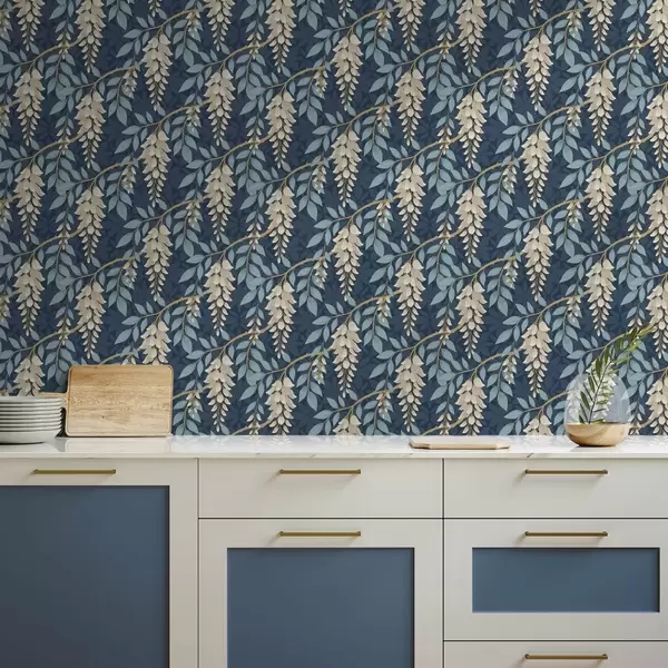 Papel tapiz Glicinia con hojas azules sobre fondo azul oscuro Nr. a00694v2