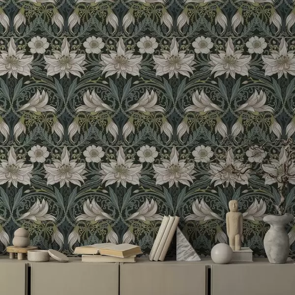 Papel tapiz Composición Art Nouveau con lirios sobre fondo oscuro Nr. a00696