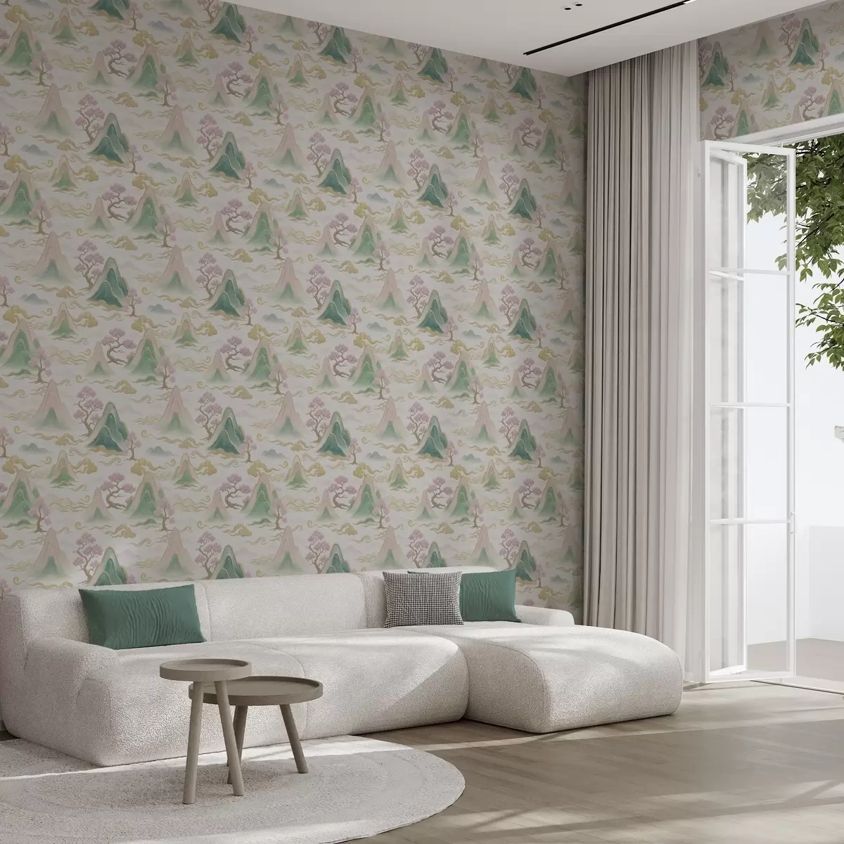 Papel tapiz Montañas, nubes y pinos en un estilo decorativo oriental Nr. a00703