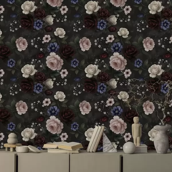 Papel tapiz Rosas oscuras, anémonas y peonías sobre un fondo intenso Nr. a00704