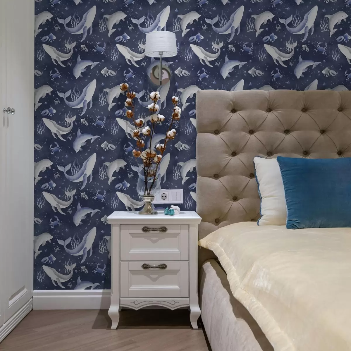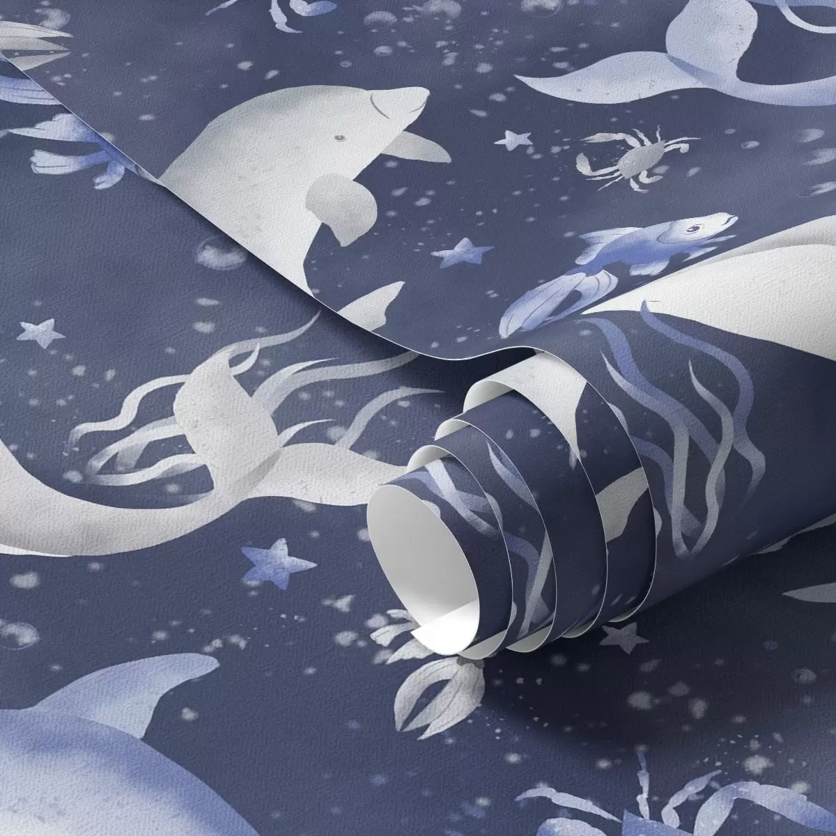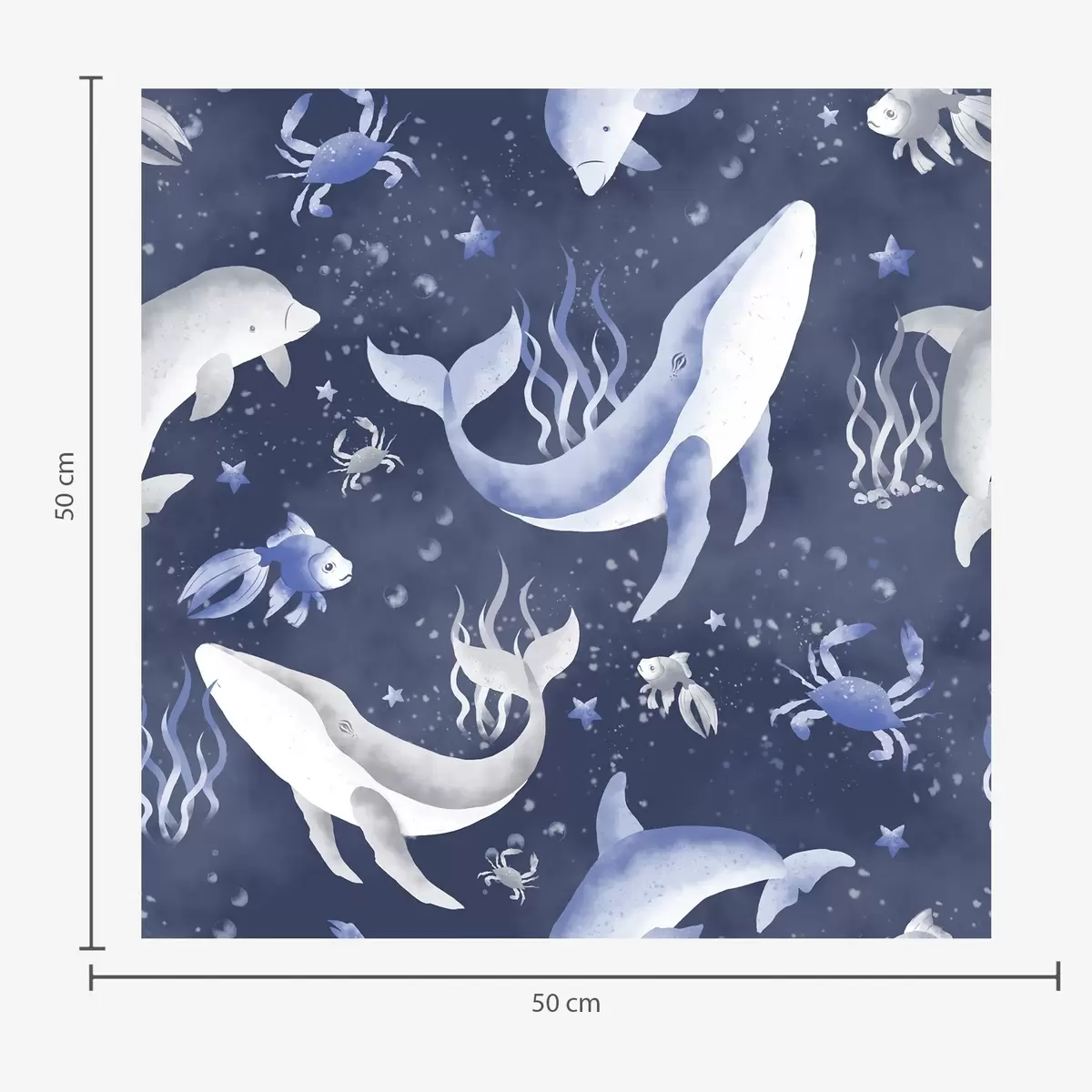 Papel tapiz Ballenas marinas, delfines y cangrejos sobre un fondo azul oscuro Nr. a00720