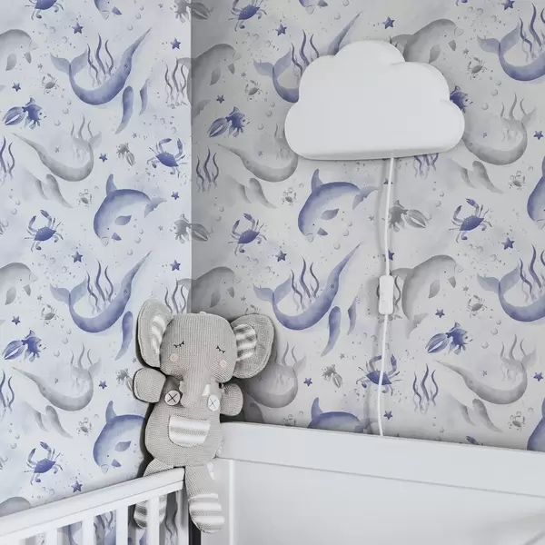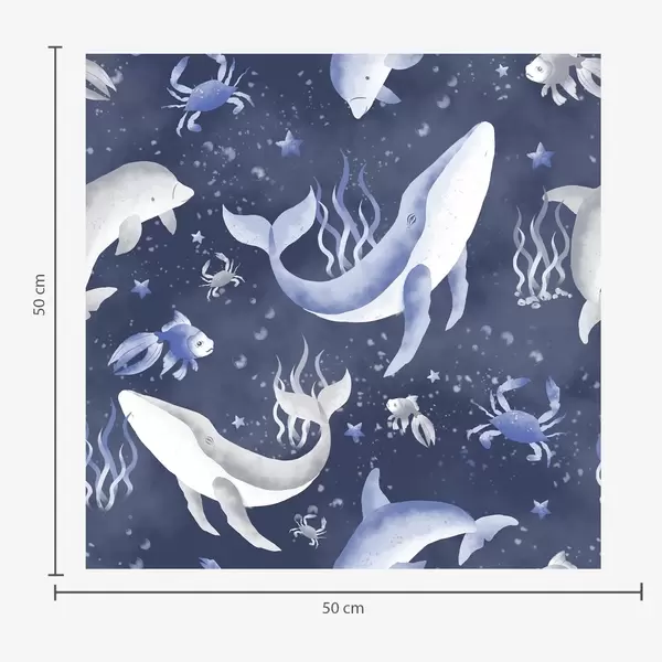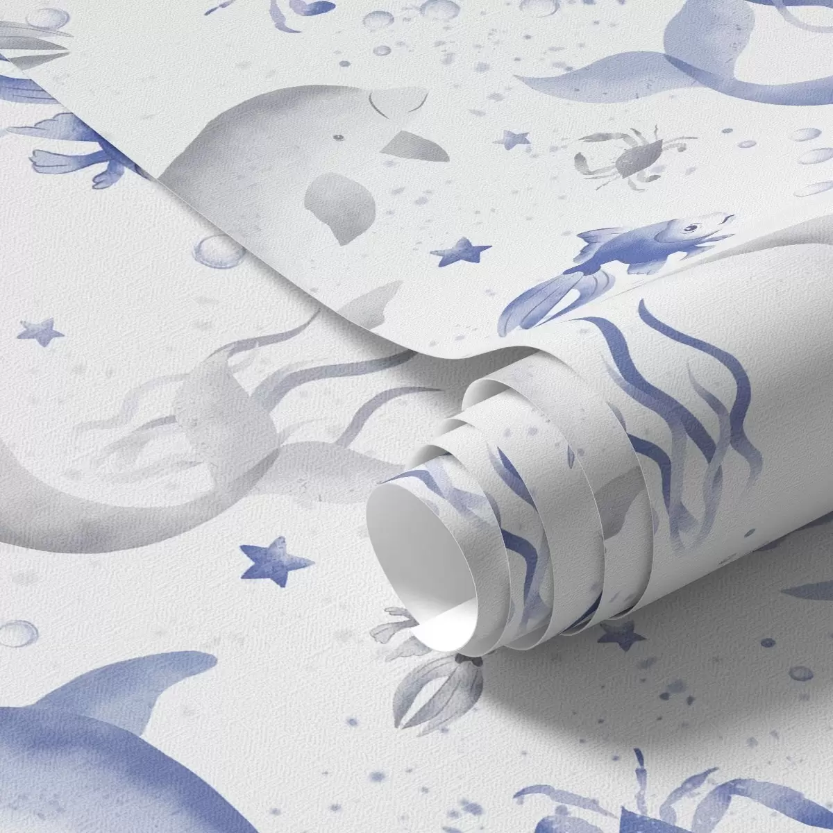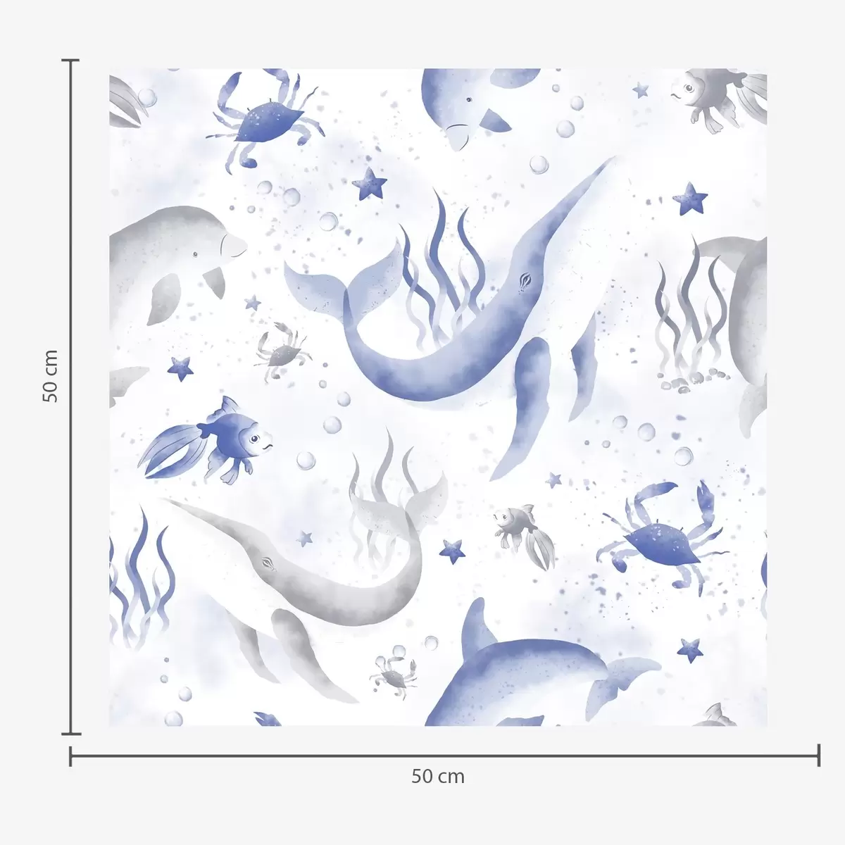 Papel tapiz Ballenas marinas y delfines en tonos azules sobre fondo blanco Nr. a00720v1