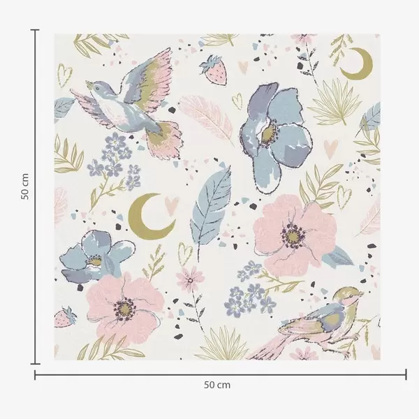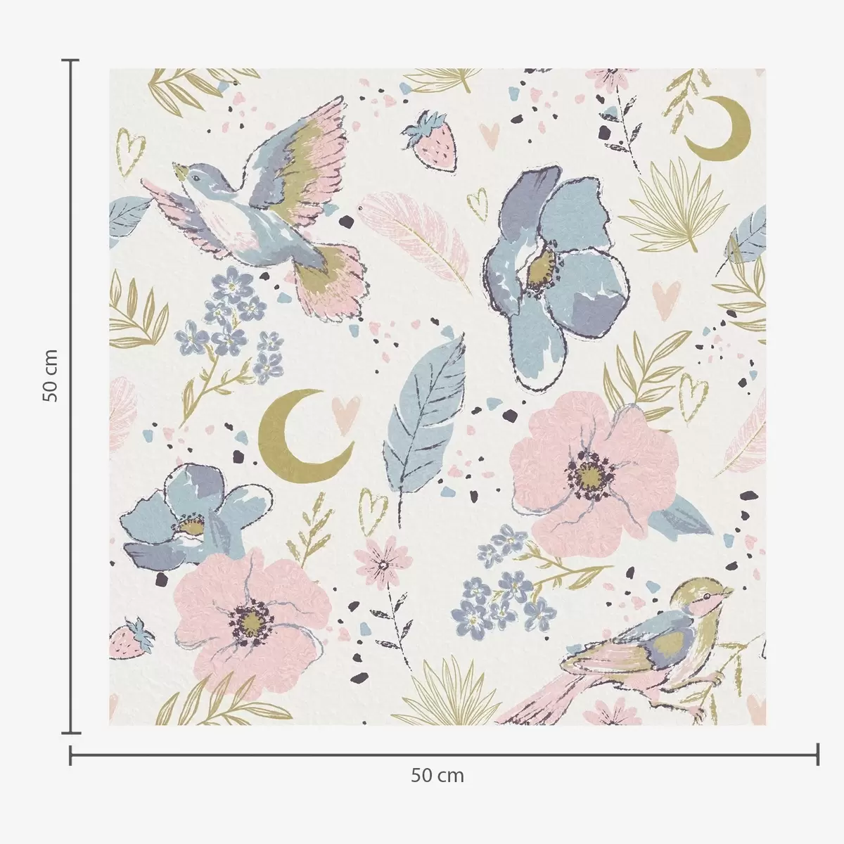 Papel tapiz Aves y flores en tonos pastel con lunas crecientes sobre fondo blanco Nr. a00721